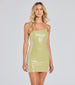 This sleeveless sequin mini dress features a one-shoulder neckline with an adjustable spaghetti strap and a sultry...