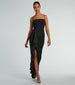 A chic silhouette meets flirty accents in the Maggie ruffled high slit formal dress. perfect for your next fancy affair! Designed with a polished crepe fabric with a complete knit lining. the long dress offers a moderate stretch. Her bodice is shaped with a sleeveless square neckline and adjustable spaghetti straps for a customized fit. Her asymmetric high waist seam adds a stylish detail. leading to a voluminous ruffled side accent with pleating. Her floor-length slim-fit silhouette features a high-cut side slit to showcase some leg and add allure. Complete your look with rhinestone jewelry and a sleek clutch.