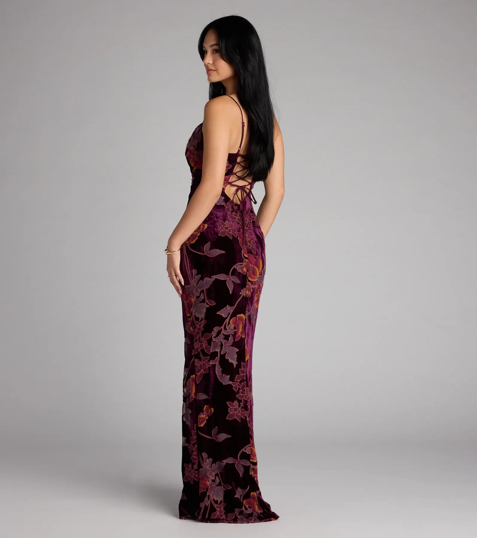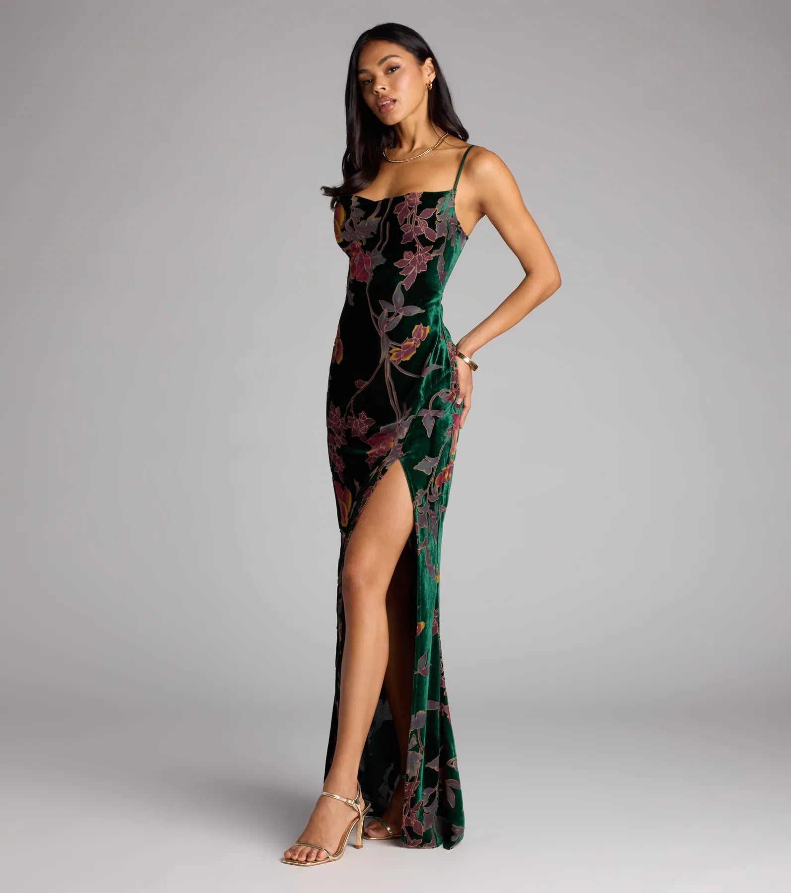 Special OccasionMeet the dress that owns the room—the Melanie stuns in plush velvet with a flocked floral...