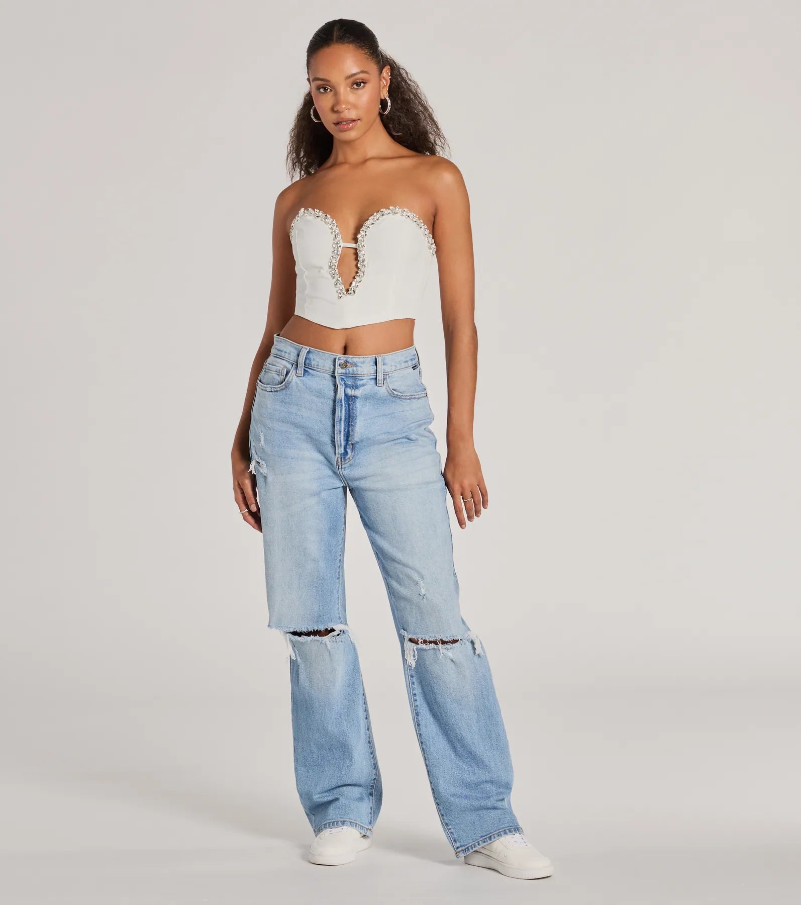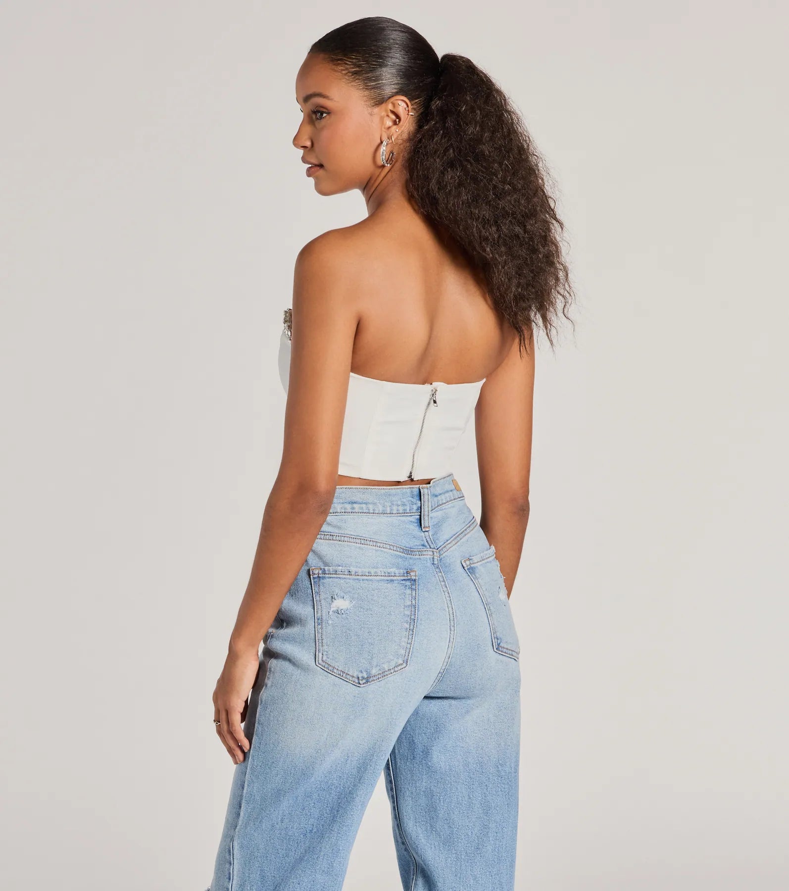 A strapless corset top features a glam rhinestone gem trimmed plunge sweetheart neckline and a fitted crop...
