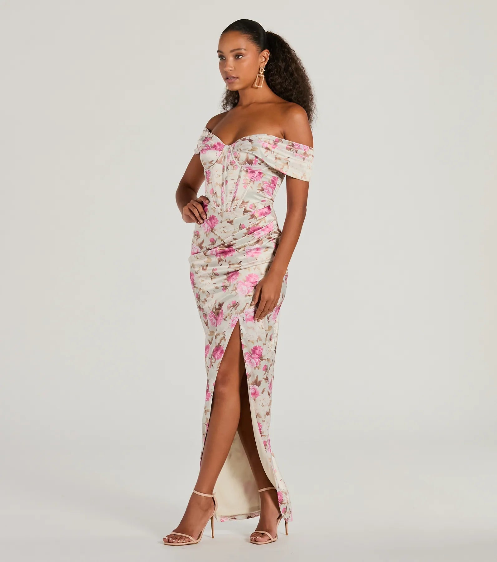 Mildred Off-The-Shoulder Floral Satin Formal Dress