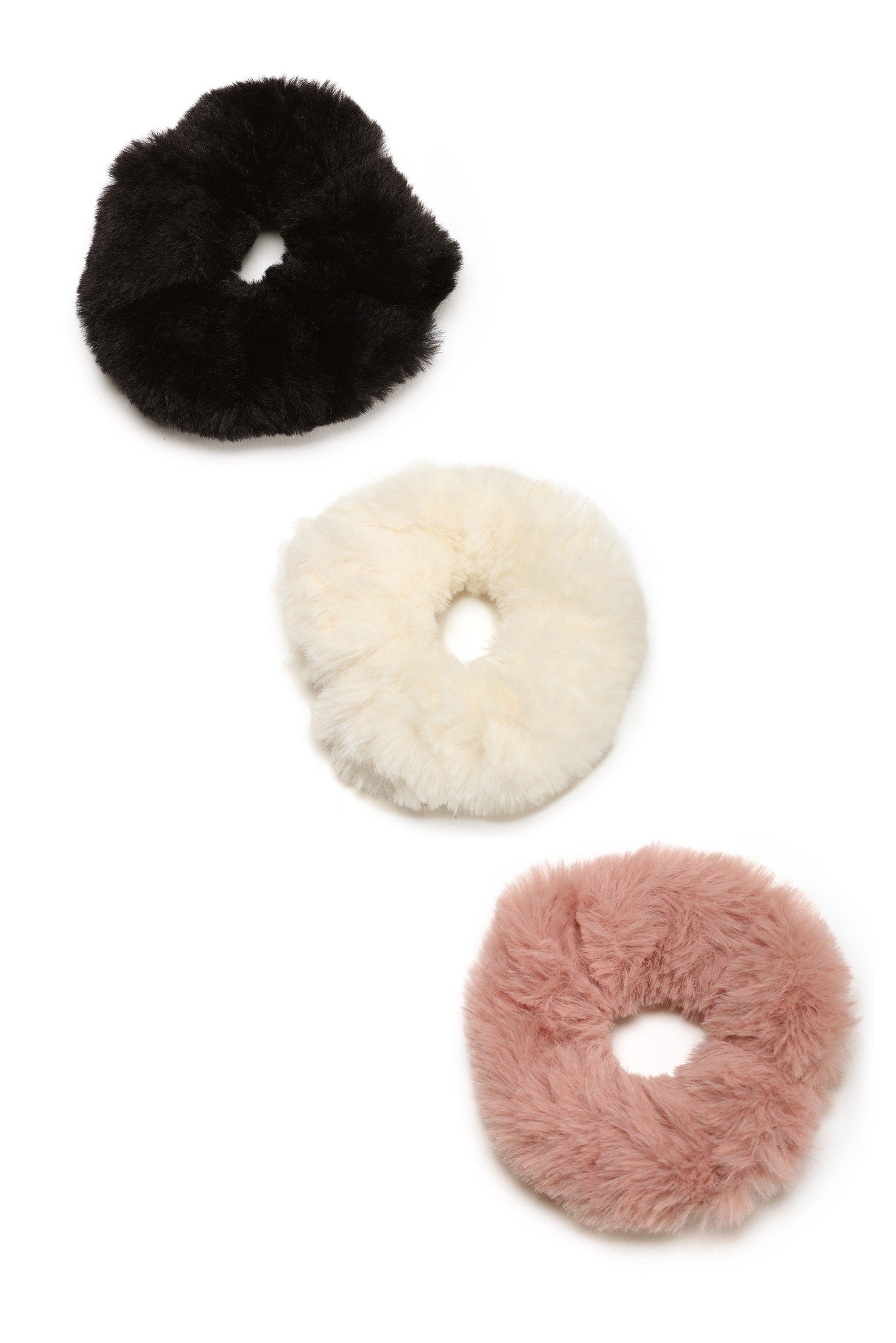 Tie up your locks in cute faux fur! 3 piece set includes mauve. ivory. and black colored...
