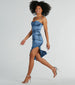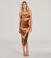 Slip into the Poppy high-slit satin formal corset midi dress for an alluring vibe at dances. parties. or weddings! Designed with a smooth satin-knit fabric. this formal dress offers plenty of stretch and a gorgeously chic sheen. She is shaped with a sleeveless sweetheart neckline with a pleated cowl neck overlay. padded bra cups for support. and features adjustable spaghetti straps so you can find your perfect fit. Her corset-style bodice has flexible boning inserts for structure and an angled high waist seam for that snatched silhouette. The asymmetric mid-length hem creates a sultry high side slit along the figure-flaunting bodycon fit. Complete the look with metallic heels for a pop of glam!