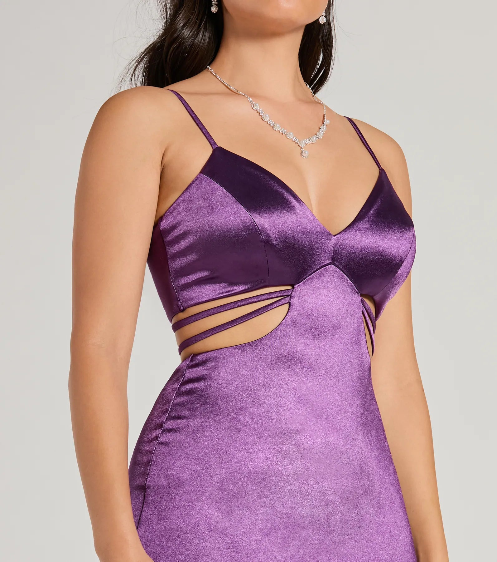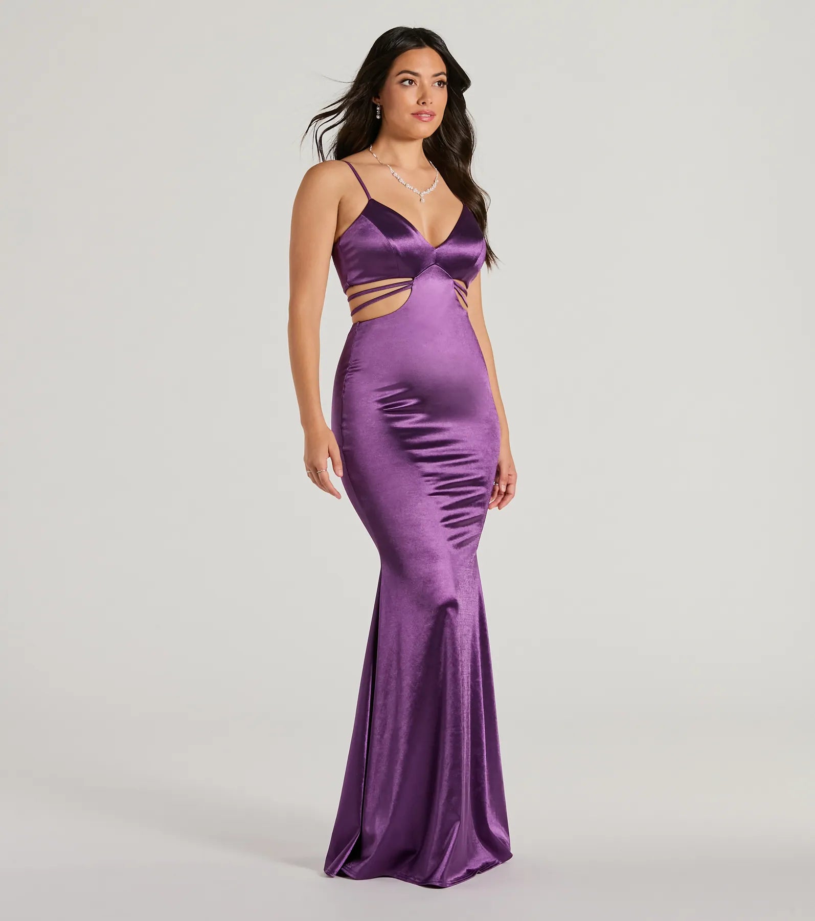 The ambiance of the room will instantly be more elegant when you strut in wearing the Pricilla mermaid satin formal dress to the banquet or gala! The plunging V-neckline. padded bra cups. and adjustable spaghetti straps beautifully accentuate the figure. while the strappy side cutouts add a touch of sultry. The mermaid silhouette and floor-length hem crafted from satin exude elegance and sophistication. making this dress perfect for any formal occasion! Complete the look in a rhinestone necklace set.