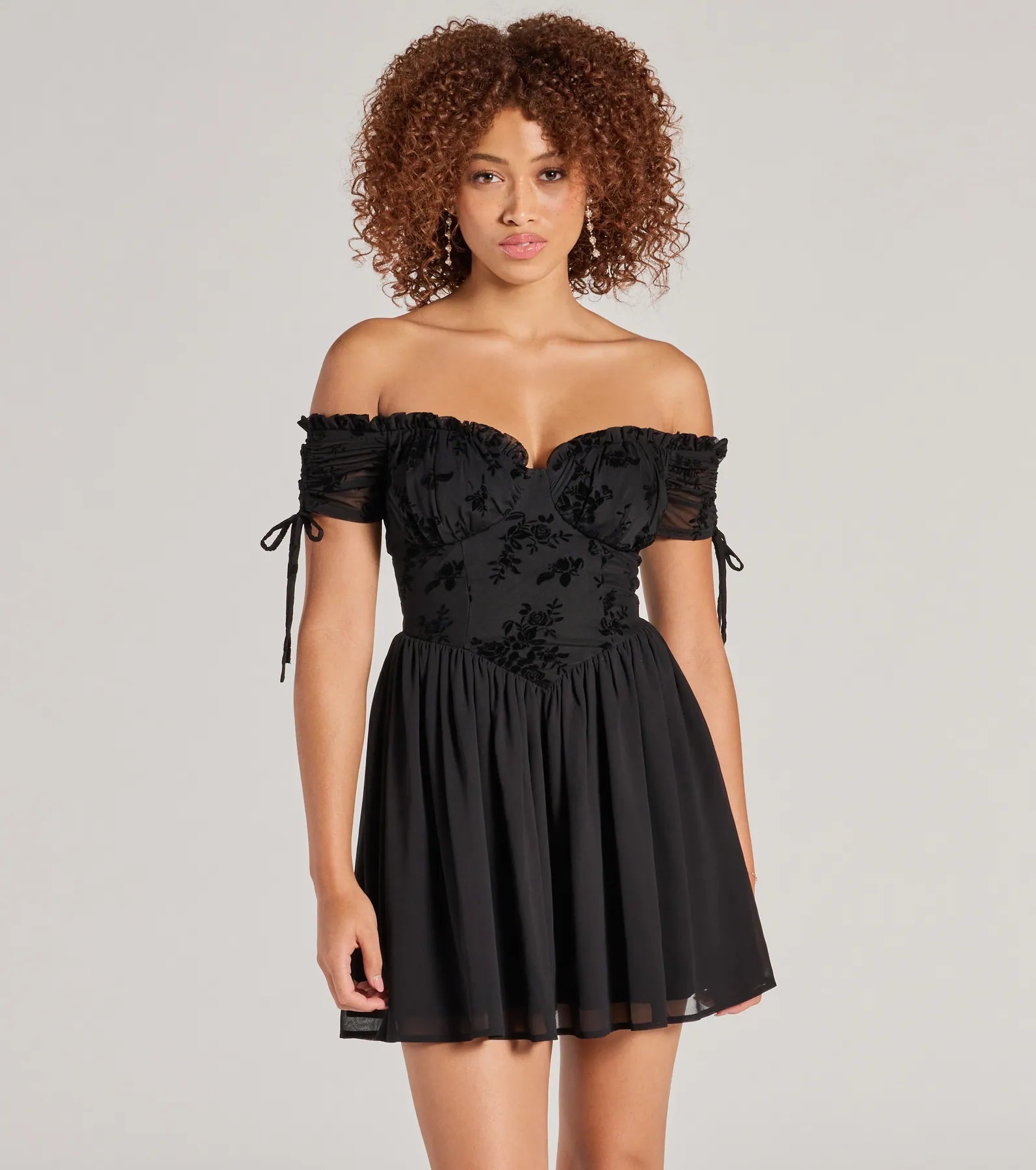 Twirl the night away in this velvet skater dress showcasing an off-the-shoulder neckline and a V-shaped waist...
