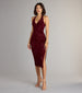 The midi dress features a sleeveless halter neckline with a single halter neck strap. a floral flocked...