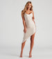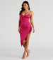 Everyone will be riveted by you in this satin midi dress featuring a sleeveless v-neckline with bungee...