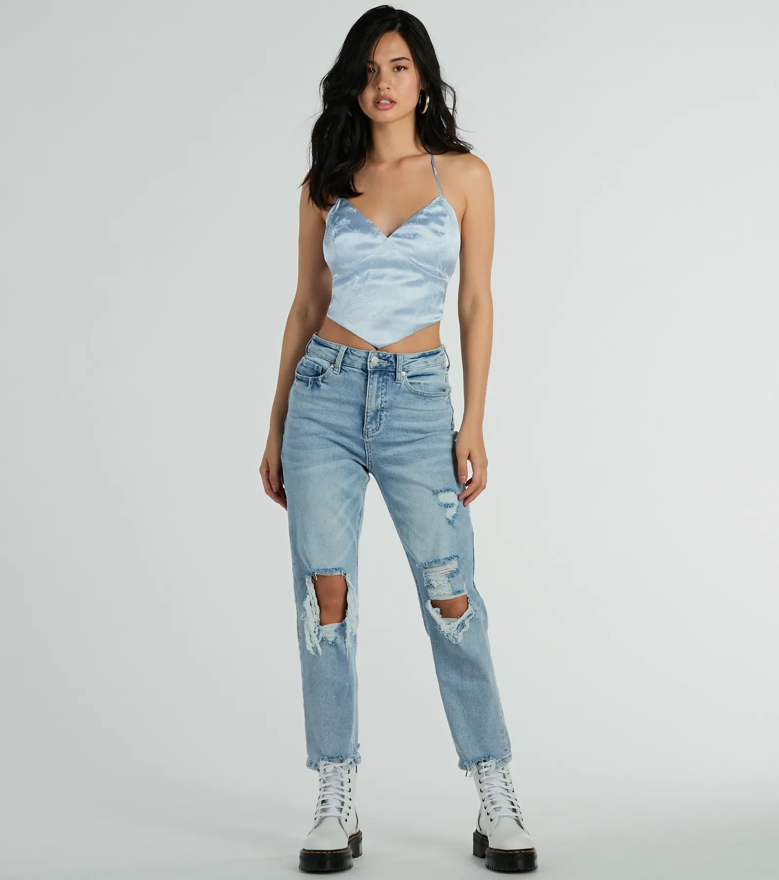 Indulge in the ultimate romantic effect in this halter tie-back floral satin top! Featuring a flattering V-neckline...
