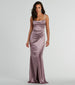 Full of chic details in a timeless silhouette. the Sam satin formal dress is an elegant option for your upcoming galas. banquets. and weddings! Smooth. silky satin craft this floor-length gown designed with the prettiest faux pearl embellished straps. a flattering cowl neckline. and padded bra cups for support. The flexible boning in her bodice gives a snatched appearance while the mermaid silhouette accentuates your curves along the floor-length hem featuring a high front wrap slit. Complete the look with dainty earrings and pumps for a sophisticated evening ensemble!