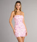 Giving flirty glam with every sparkle. This strapless mini dress shines with floral sequins and a lace-up...