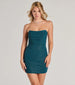 Shimmer with beauty in this glitter knit mini dress featuring a strapless angled neckline with a ruched...