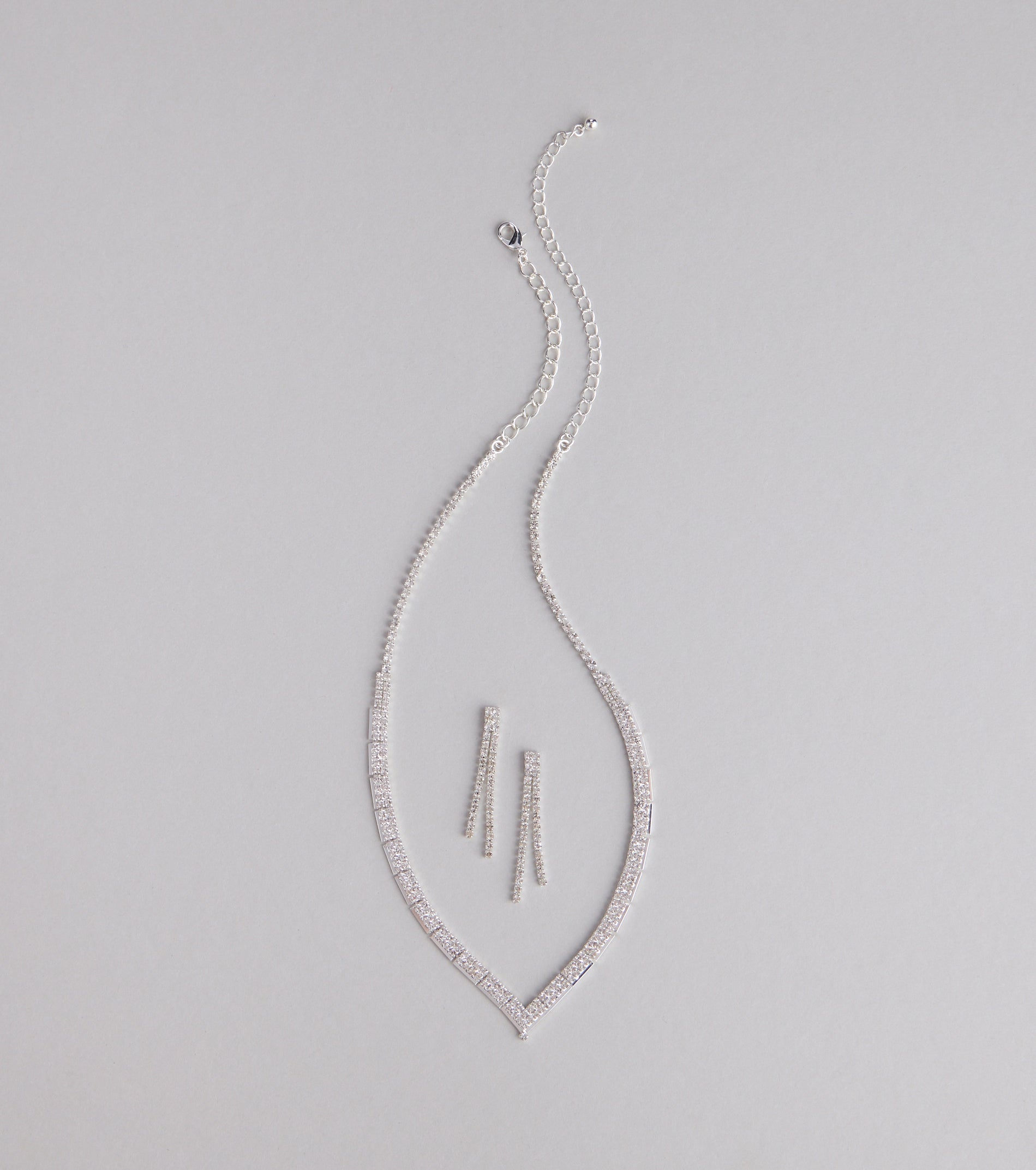 Instant glam. zero effort. This rhinestone embellished necklace with matching earrings is your one-stop shop for a...