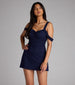 Giving soft drama and sweet details! This cold shoulder mini dress flatters with a twist-front sweetheart neckline...
