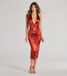Sleek And Iconic Satin Halter Bodycon Midi Dress