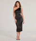 Sleek and stunning. this satin midi dress features a one-shoulder neckline and a ruched slim-fit silhouette perfect...