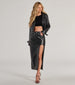 This sleek faux leather midi skirt features a high-rise waist and a midi-length hem accented with a...