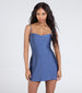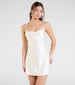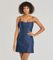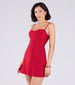 The mini dress features a sleeveless square neckline with a pleated bust. spaghetti straps. and an A-line...