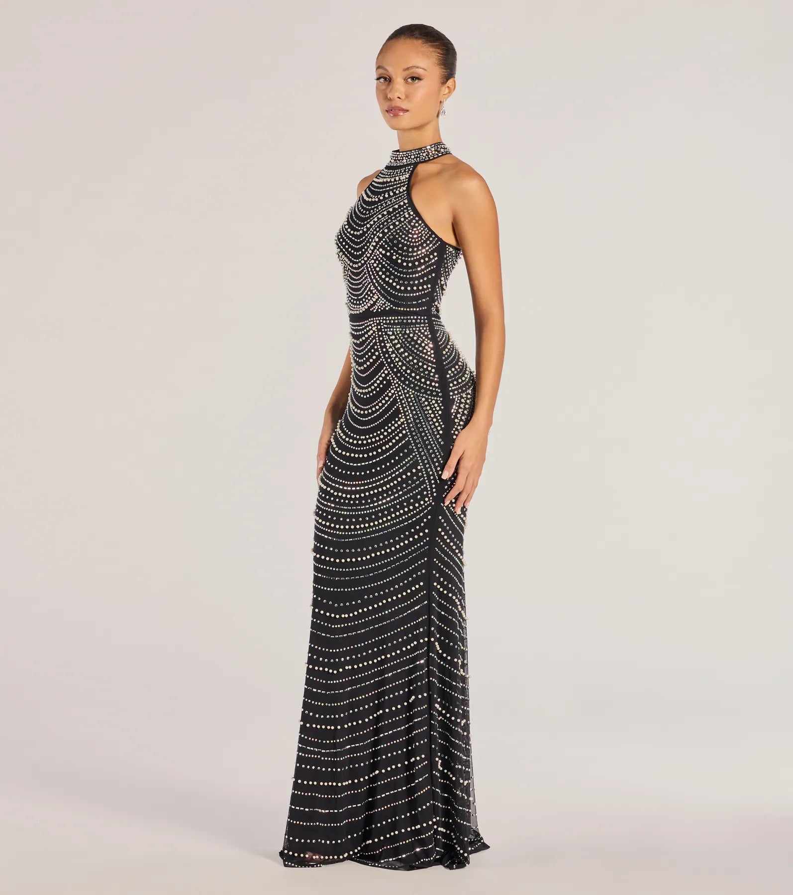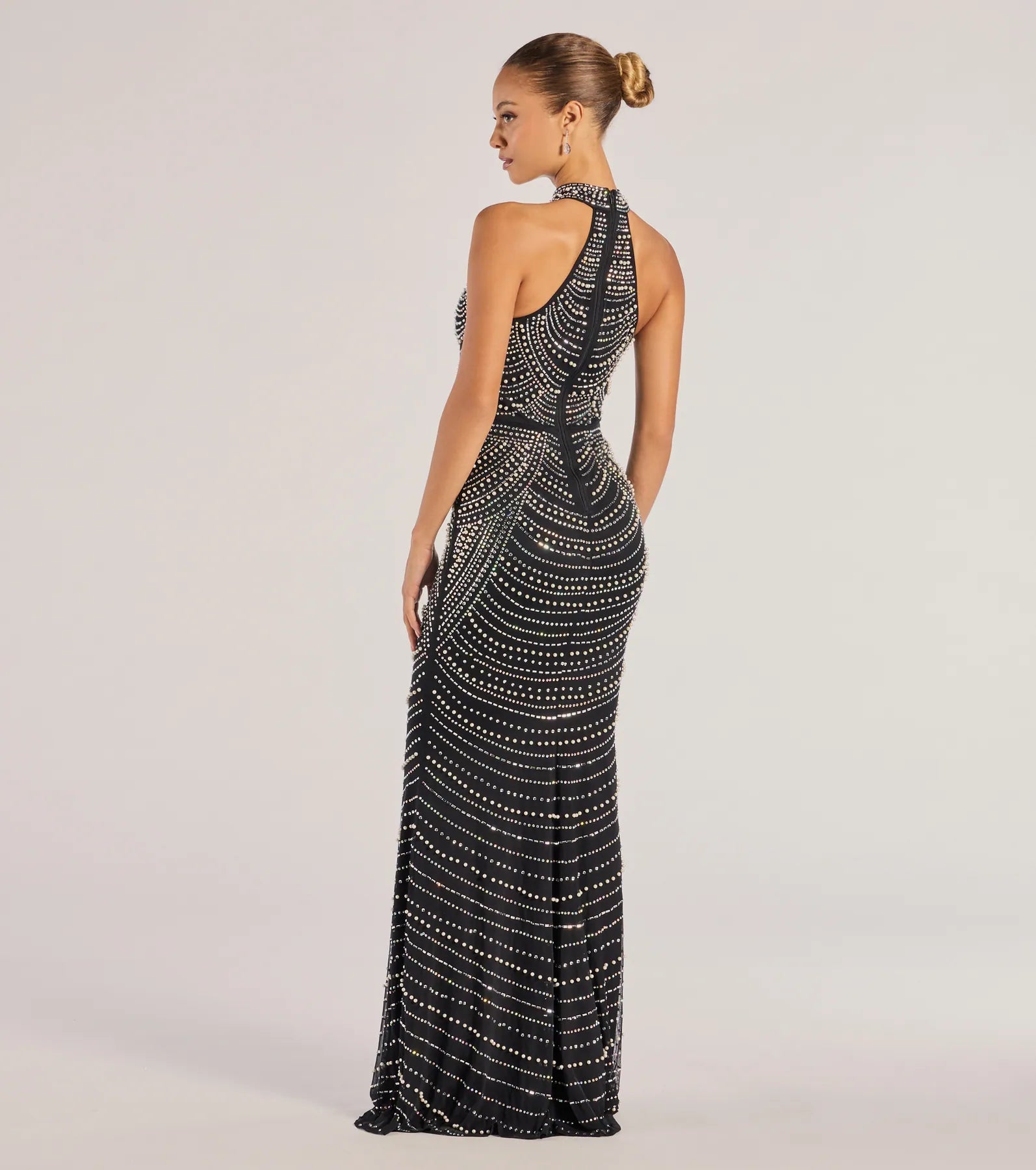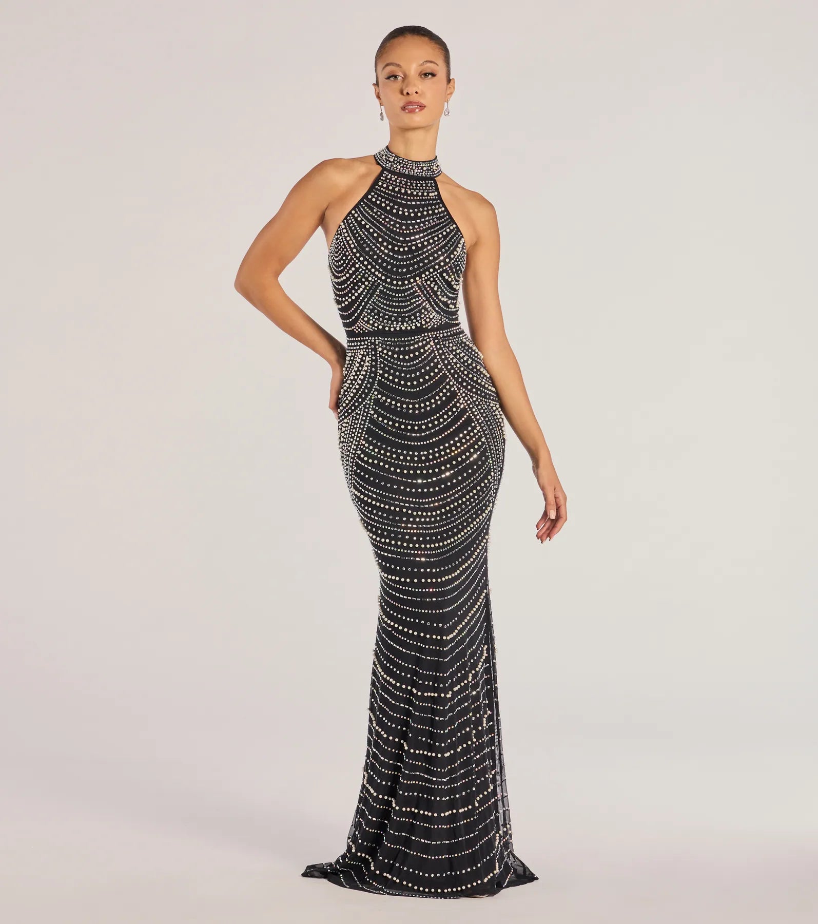 Special OccasionThe long mermaid dress features a sleeveless halter neckline with a high neck collar. faux pearls...