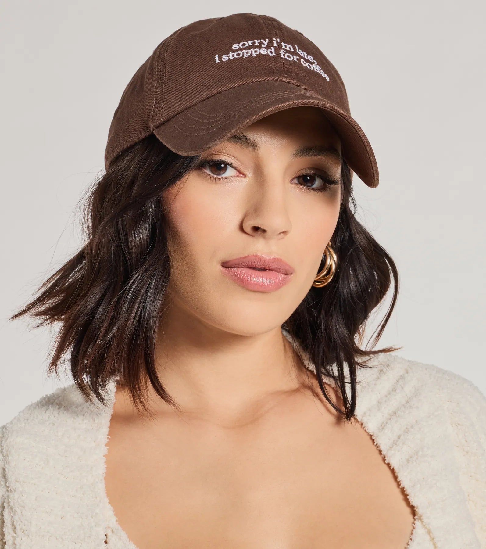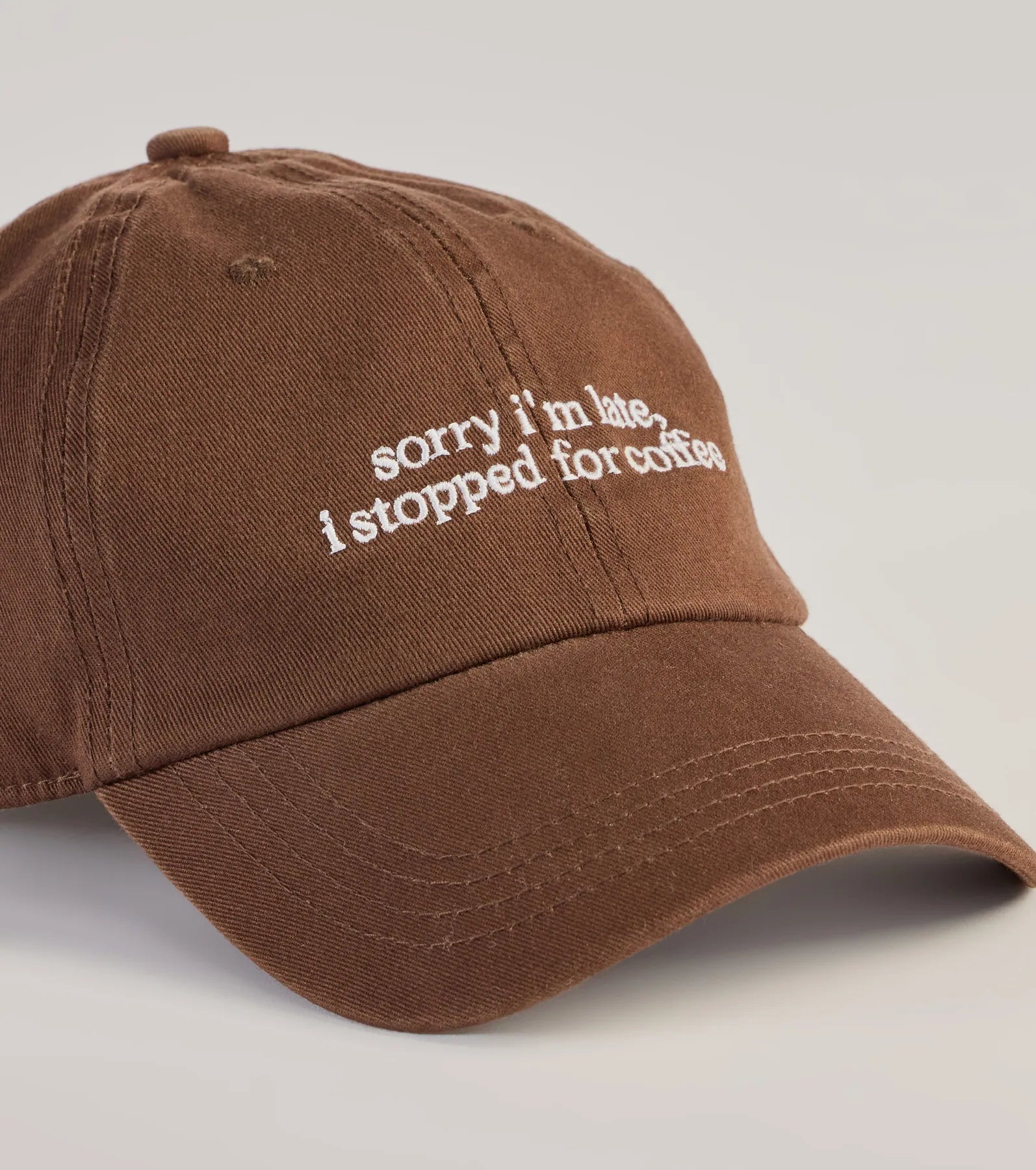 The perfect baseball cap for all coffee lovers! This adorable hat features an embroidered script reading. "sorry...