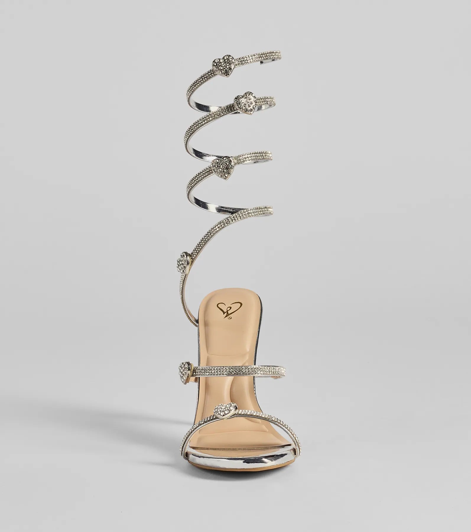 Perfect your glam game with sparkly stride metallic spiral strap stiletto heels. Featuring rhinestone embellishments and a...