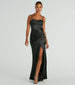 Stunning from every angle! Serve pure elegance in the Stacie satin formal dress - a sultry option for bridesmaids. dressy cocktail parties. and celebrations. It features a sleeveless sweetheart neckline with a pretty cowl draping. adjustable spaghetti straps. a padded bust. and a corset bodice with flexible boning. The side pleated seam creates the asymmetrical form-hugging silhouette with a wrap-long hem and slit design. The formal dress is composed of a silky soft satin-lined fabric with a moderate stretch.