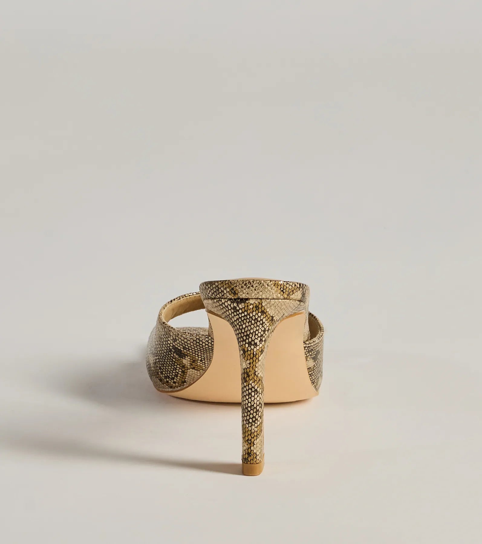 Step into these striking snake print stiletto mules perfect for a date or a girl's night out!...