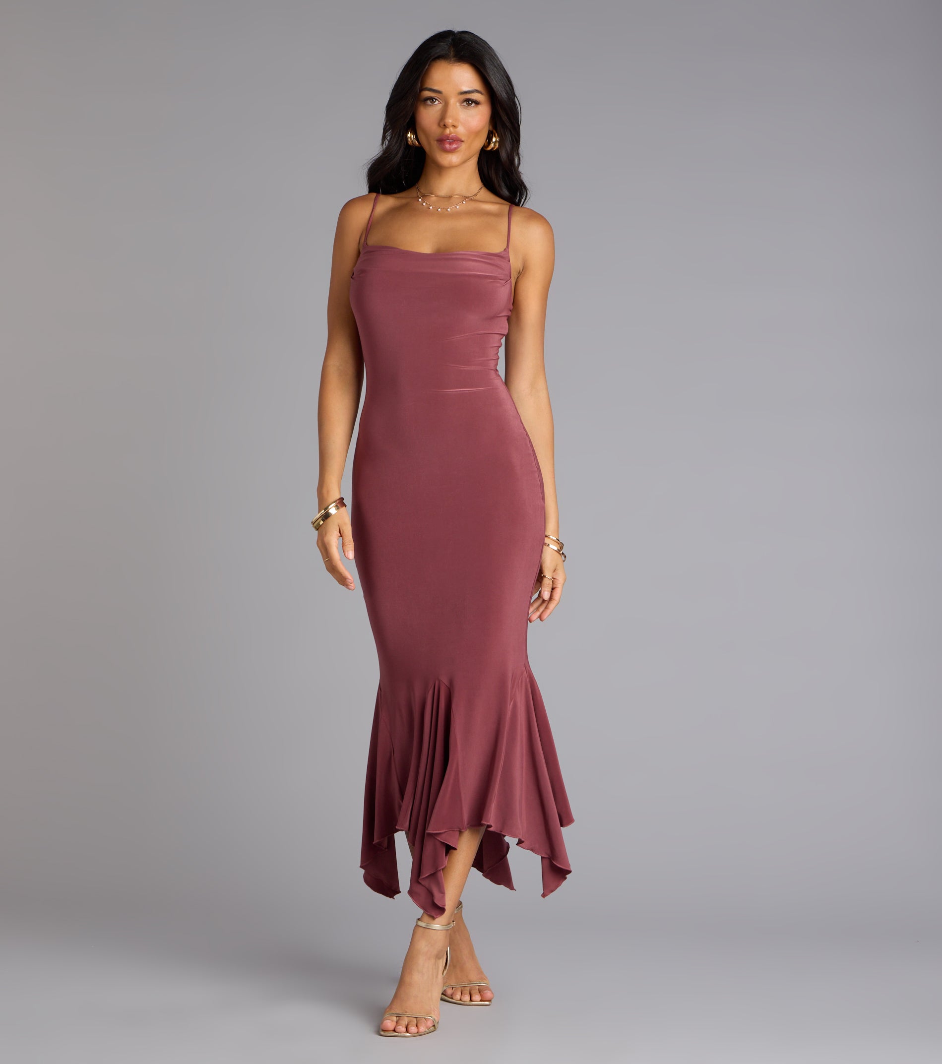 Show off a stunning silhouette in this sleek knit midi dress featuring a sleeveless square neck. ruching...