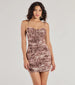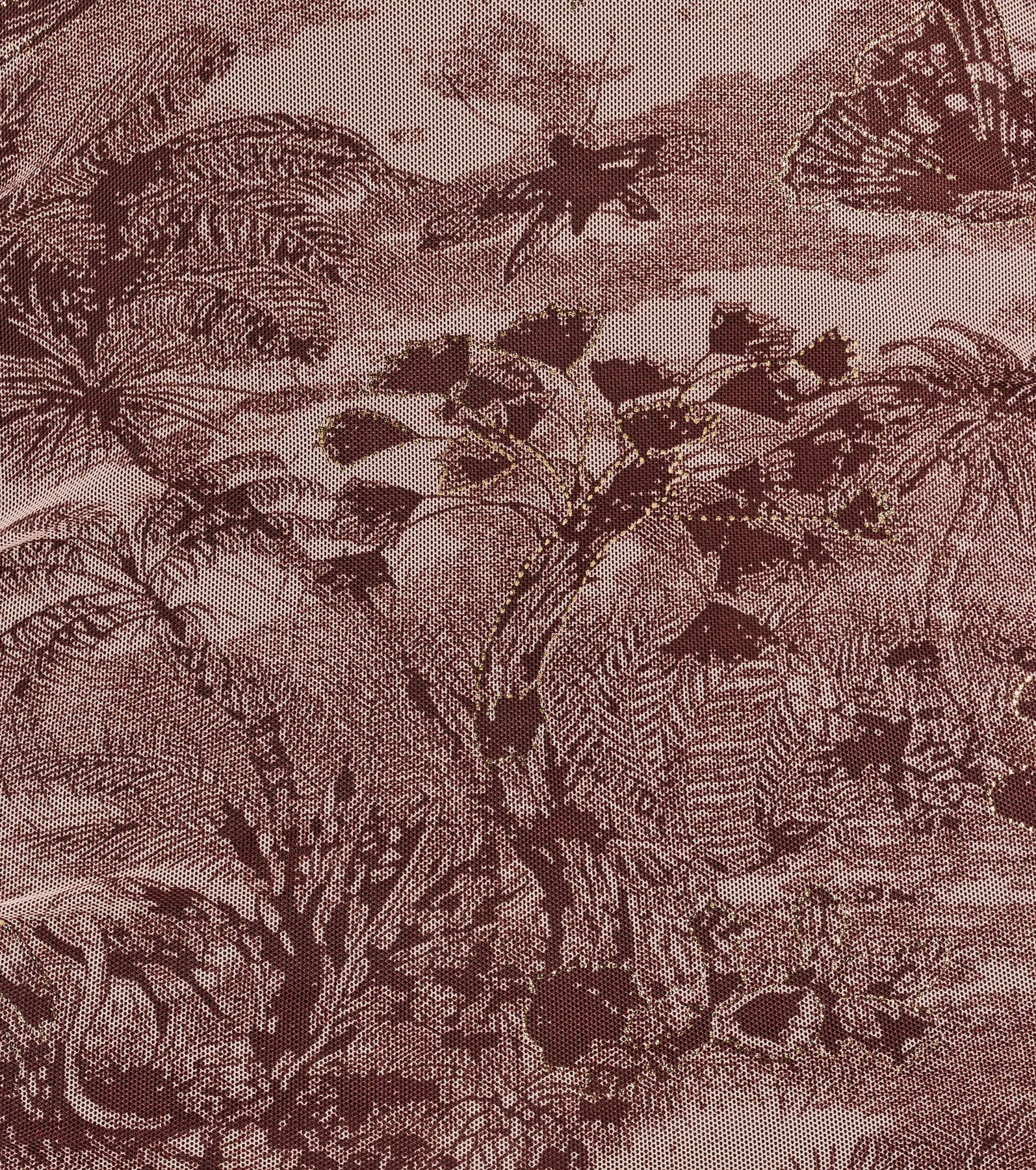 Showcase a stunning look in this mesh mini dress detailed with a nature-inspired scenic print and metallic...