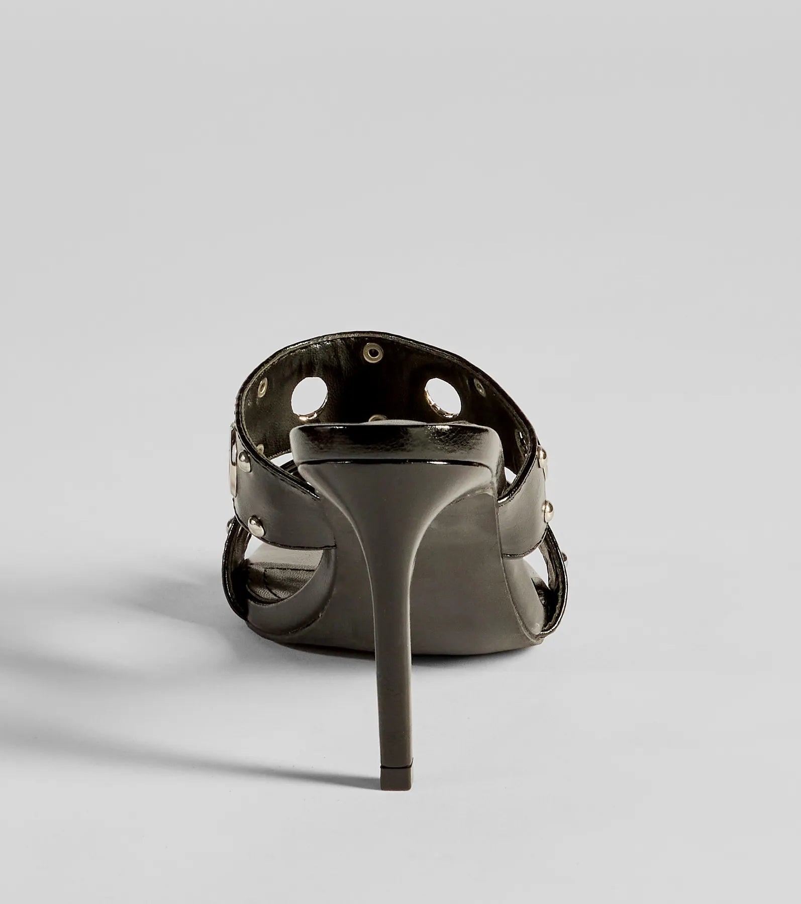 Chic with a stylish edge. these faux leather mules feature an open almond-shaped toe. a dual-banded strap...