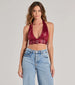 Take on a sultry vibe in this faux leather crop top featuring a plunge halter V-neckline and...