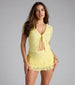 This airy sheer lace top is totally summer approved. featuring short sleeves. a V-neckline. and a tie-front...
