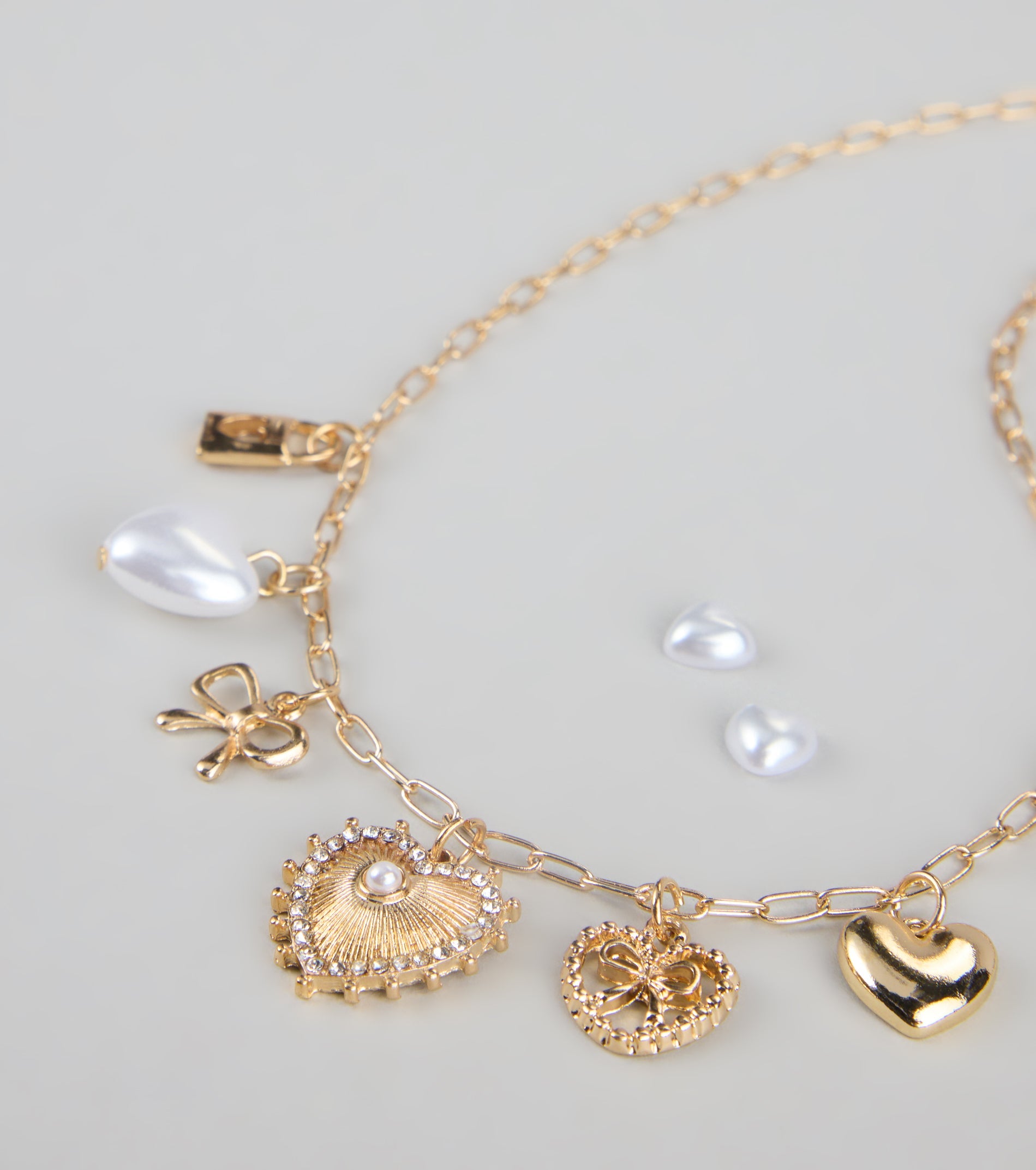 Serving soft-girl romance with a side of playful sparkle. This charm necklace layers pearls. hearts. and bows...