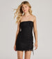 This stunning strapless lace mini dress will make everyone swoon over your beauty at summer parties! Crafted with an airy sheer lace fabric with a knit lining for coverage. this mini-length dress is the charming style you need for the season. It features a strapless straight-across neckline with a dainty trim. a ruched seam to accentuate your curves leading to an adjustable drawstring and side slit. a ruffled hem for a flirty vibe. and a bodycon fit to flaunt your figure. Complete your look with hoop earrings and espadrille sandals.