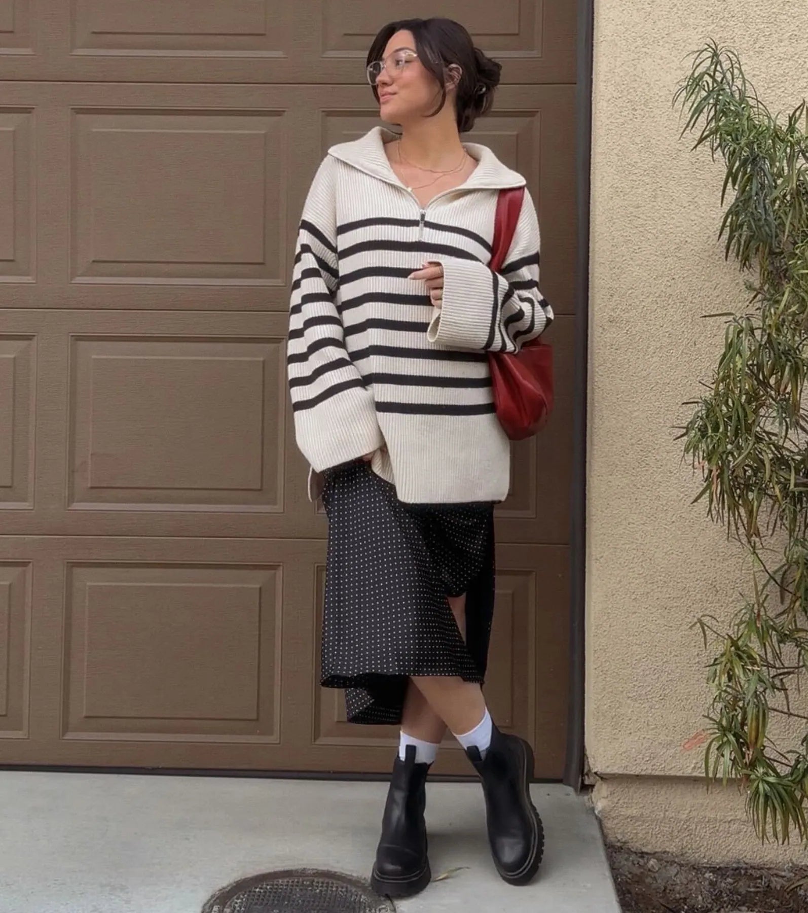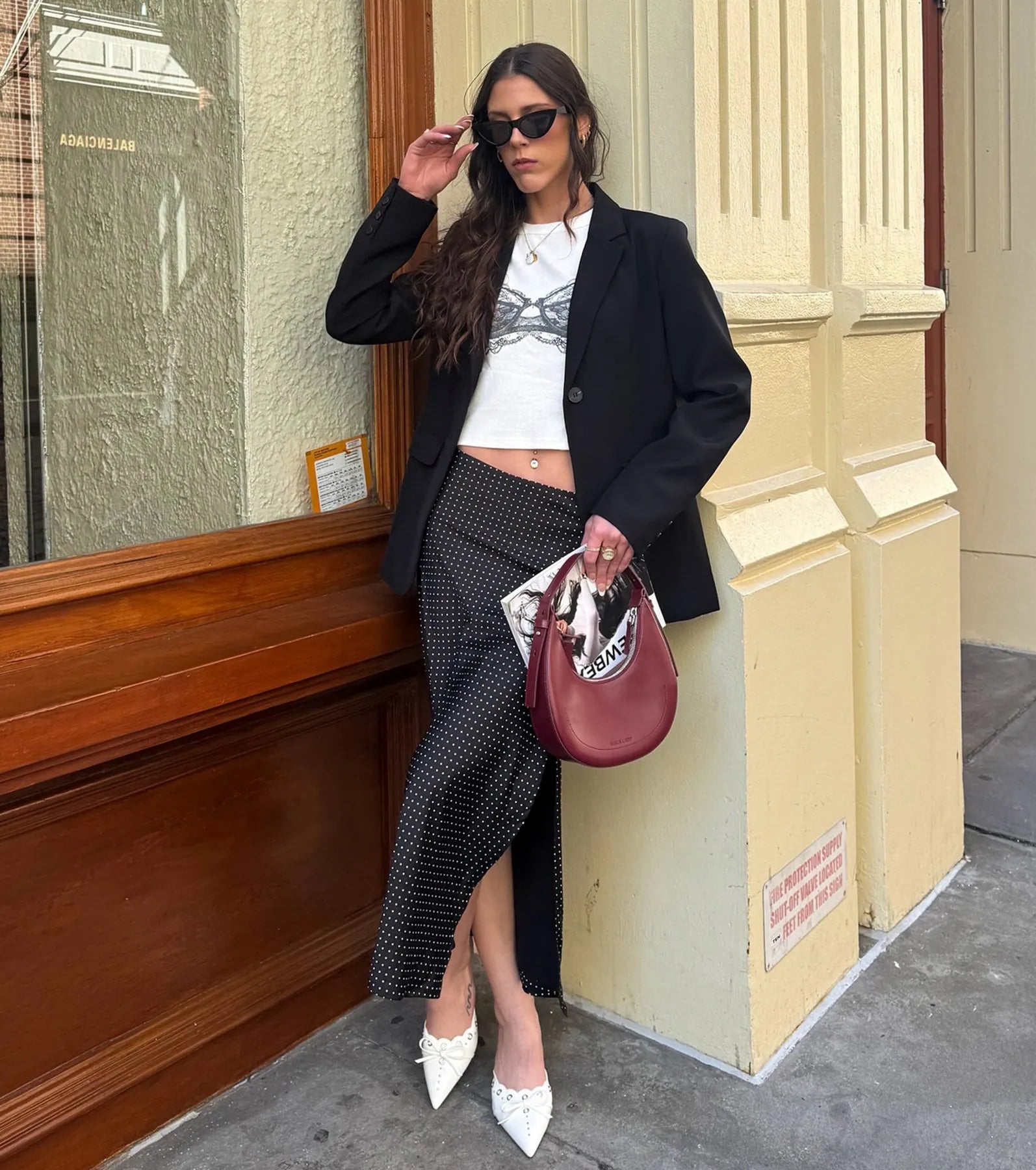 Cue the perfect background song as you strut in this high-rise midi skirt flaunting chic polka dots...