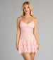 Romance with a side of spice. This lace mini dress stuns with flirty tiers. a curve-hugging fit....