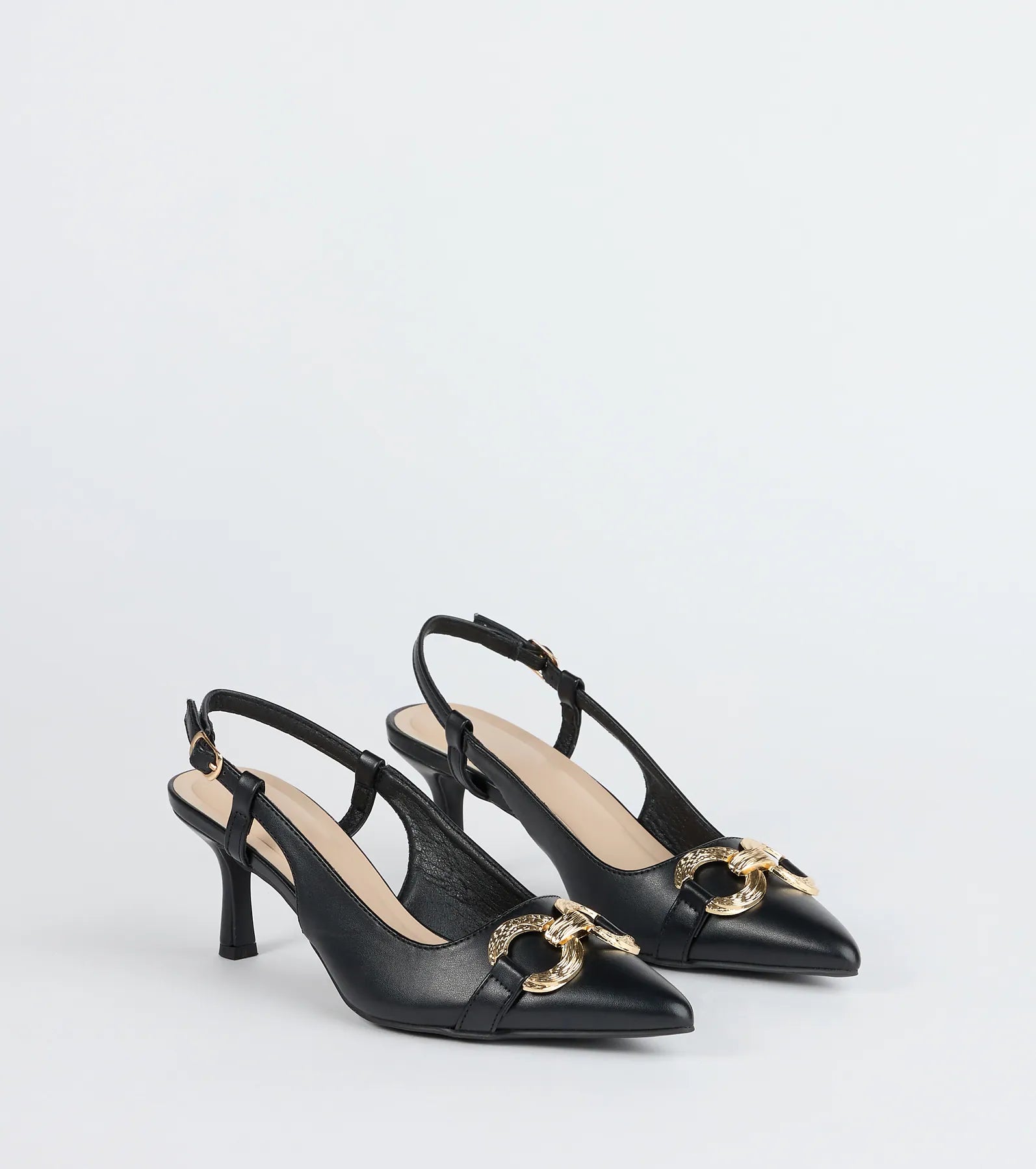 So sleek. these slingback stiletto pumps feature circular buckle accents for a trendy touch.Fit & Features Stiletto...