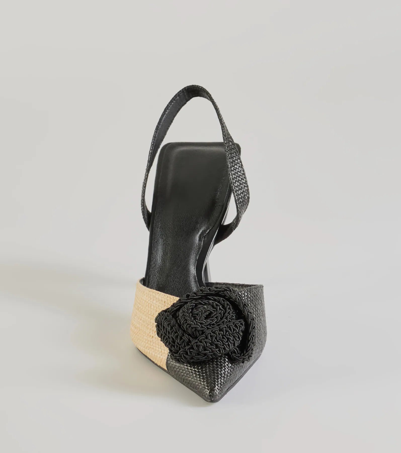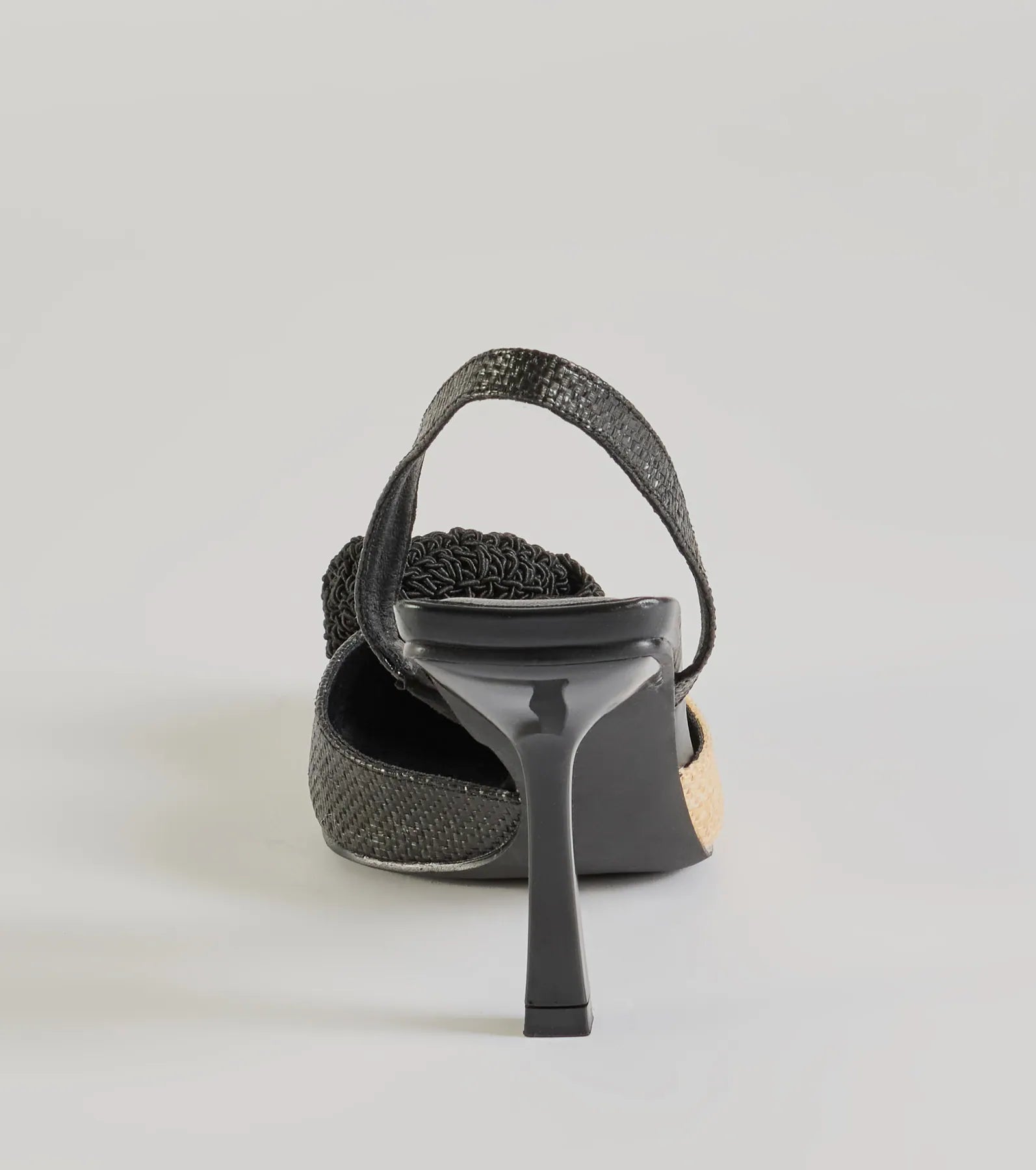 Show up looking trendy and fab in these raffia design pumps featuring a closed pointed toe with...