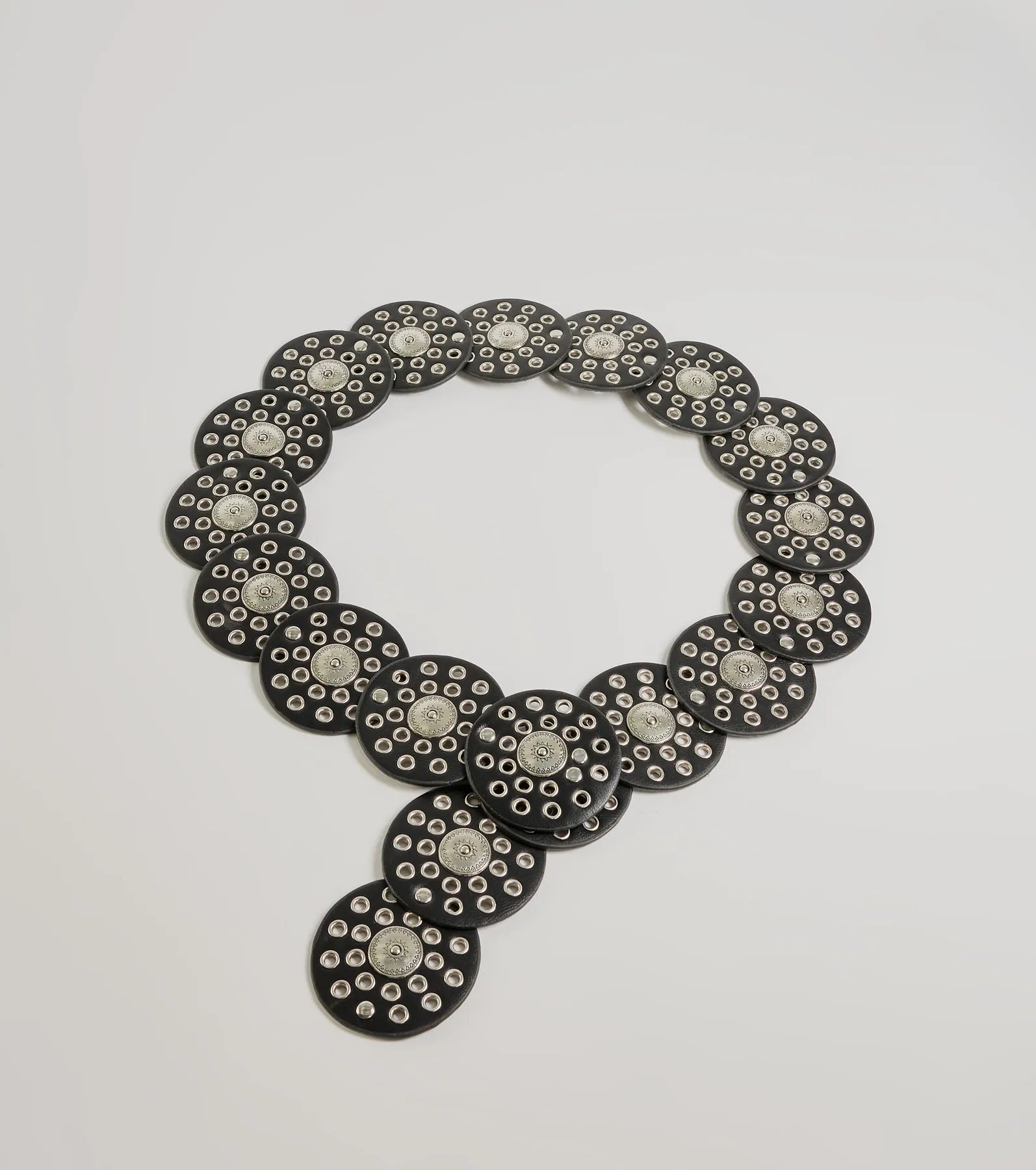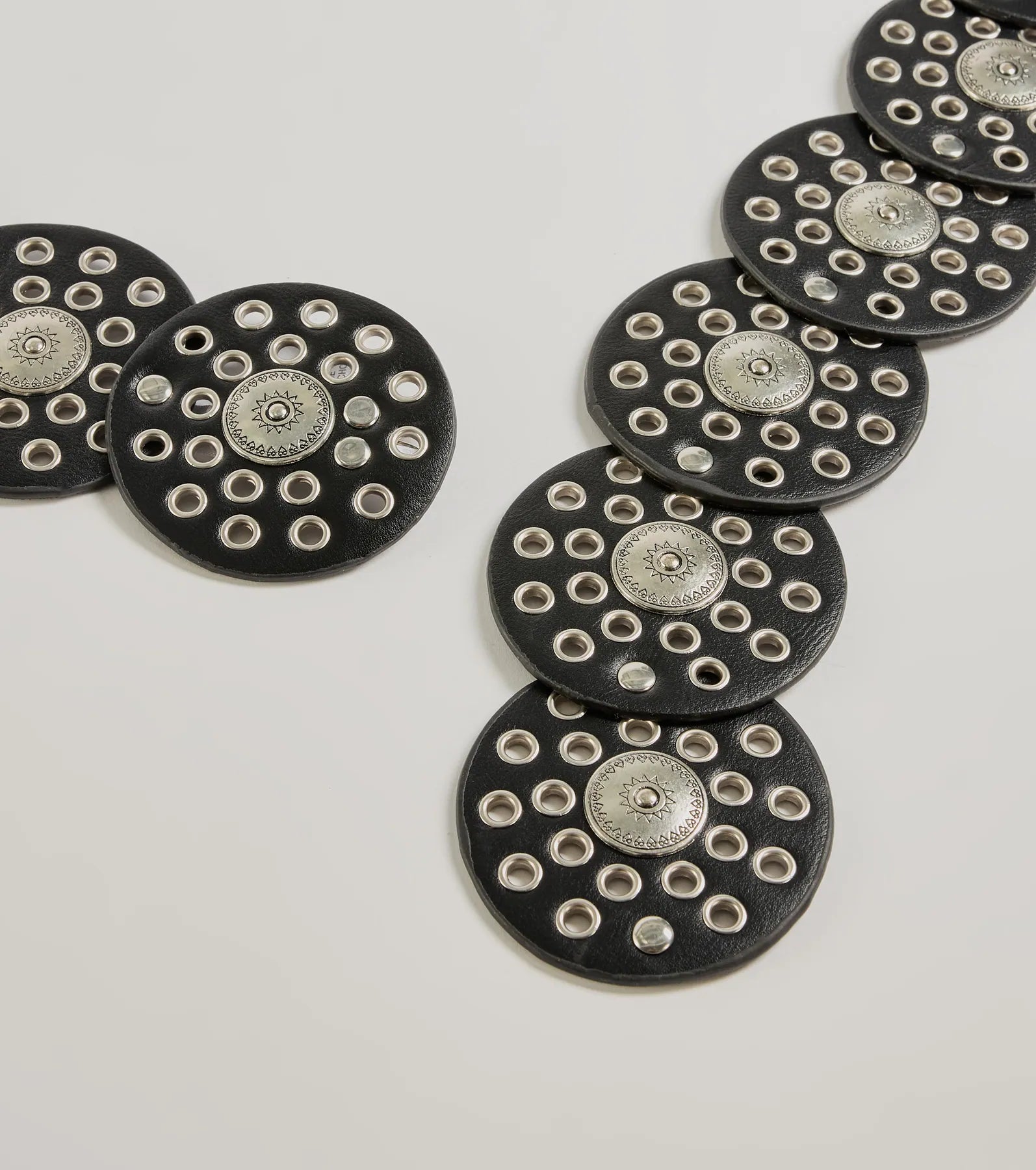 A statement concho belt features faux leather circular shapes with medallion centers and grommet accents giving it...