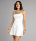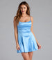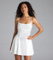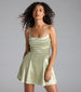 A sleeveless satin mini dress features a flattering pleated square neckline and skater silhouette perfect for all-night...