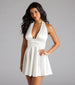 This silky satin skater dress features a trendy V-neckline with a halter strap. an open back with...