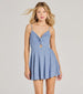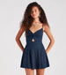 The glitter knit skater romper features a sleeveless V-neckline with a trendy twist-front design followed by a...