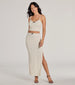 A lace maxi skirt featuring a high-rise waist with a bow. side slit. and a form-hugging fit....