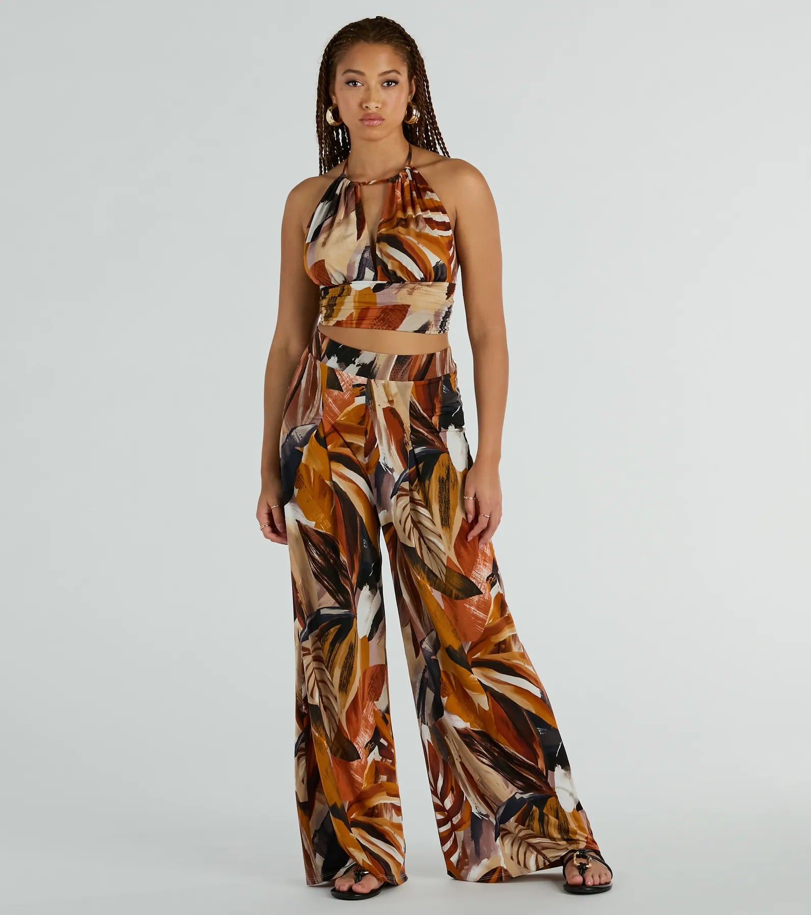 This alluring tropical halter crop top will have you ready for a dreamy vacay! The lined stretchy knit fabric features a bold abstract tropical print pattern to catch all the glances on your getaway. The crop top is shaped with a sleeveless halter neckline with a sultry V-shaped cutout. tie-back halter straps. ruched side seams to accentuate your curves. and a form-hugging fit for a snatched look. Style with the matching wide-leg pants and hoop earrings.