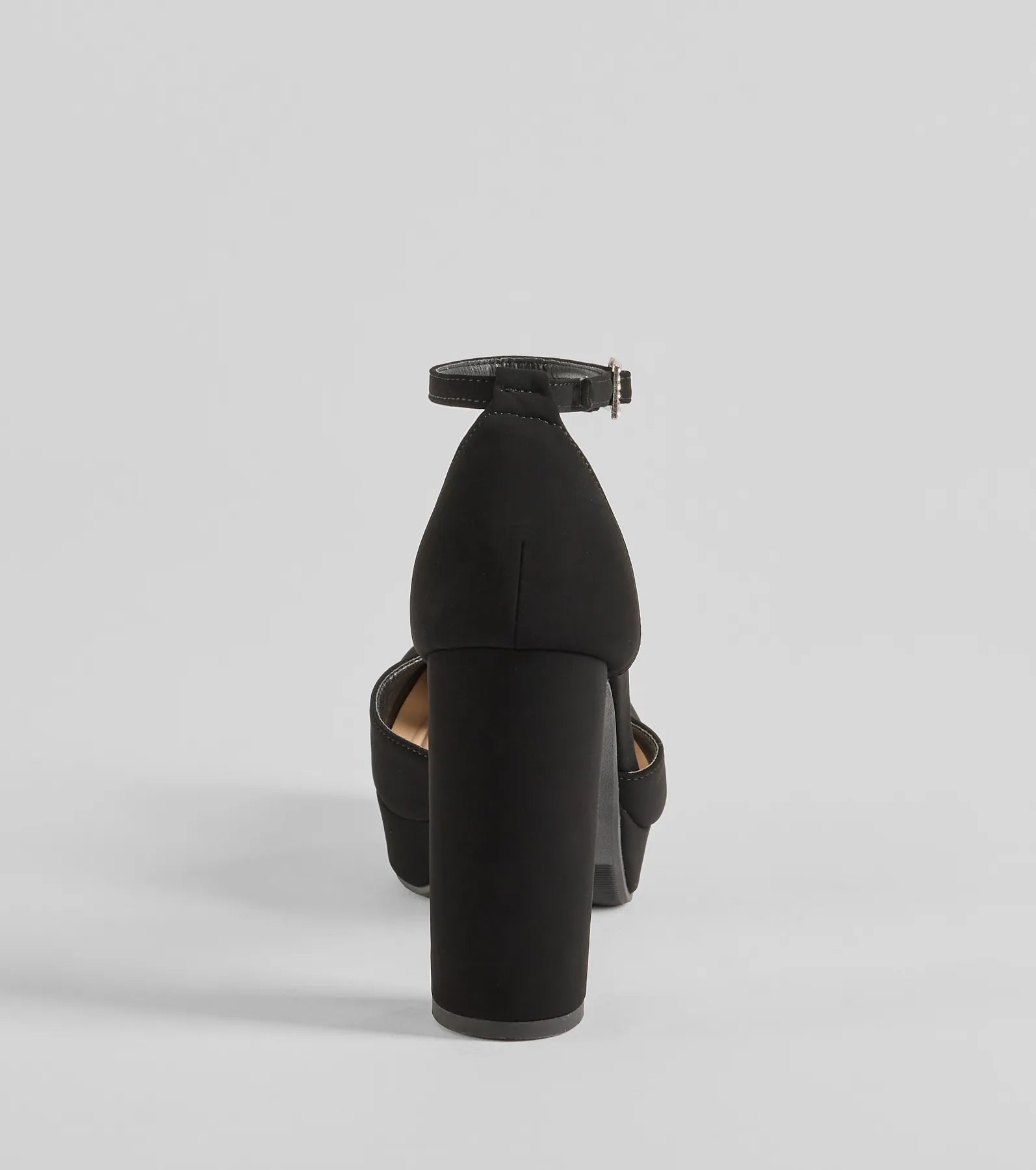 Fit & Features Block heel Faux nubuck material Closed pointed-toe Adjustable ankle strap with rhinestone buckle Platform...