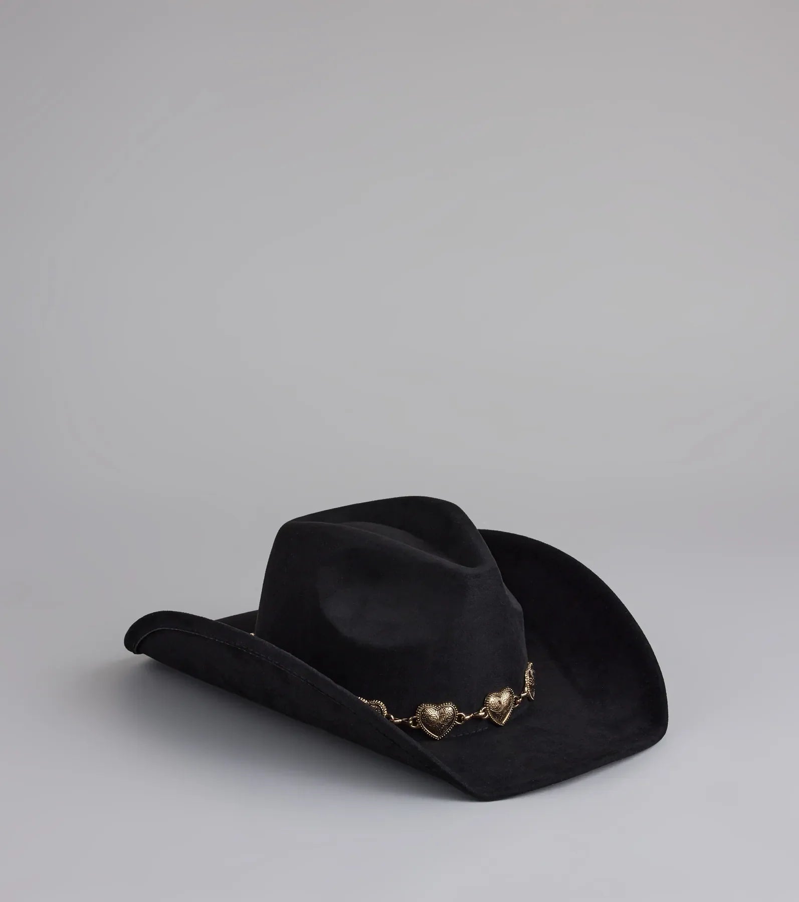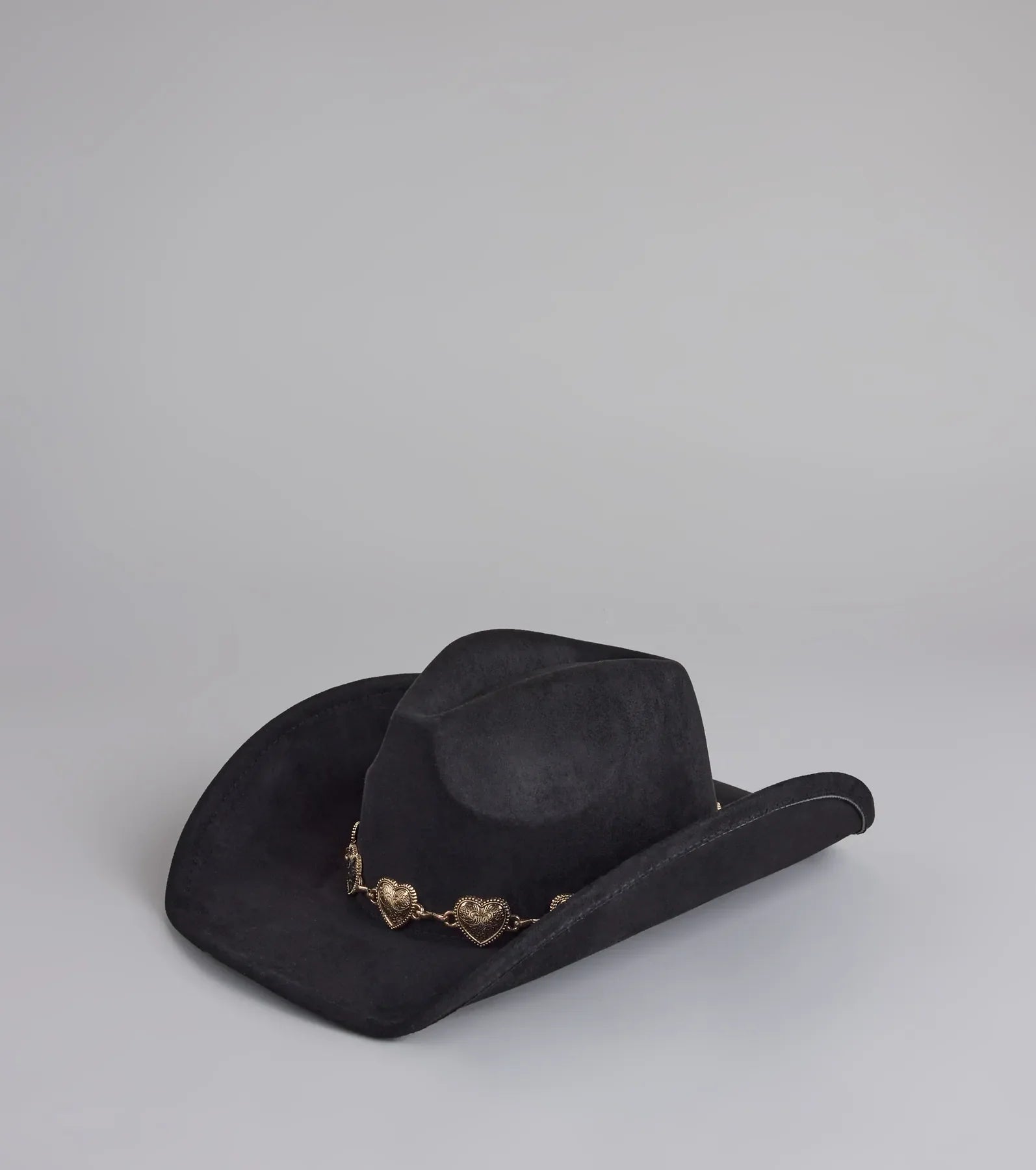 Look like a total western babe with this faux suede cowboy hat featuring a heart concho chain-link...