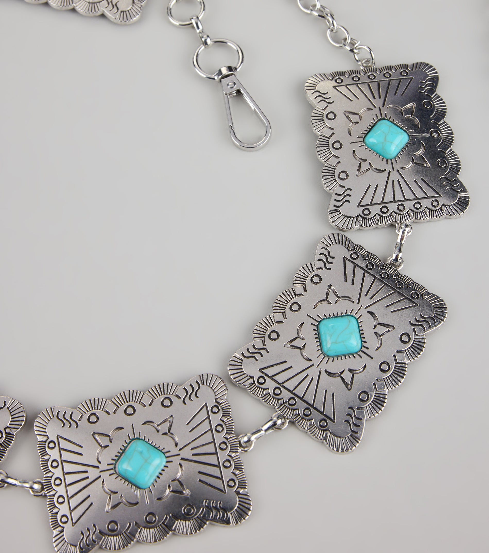 Saddle up. but make it trendy with flair. This etched concho chain belt brings a western trendiness...