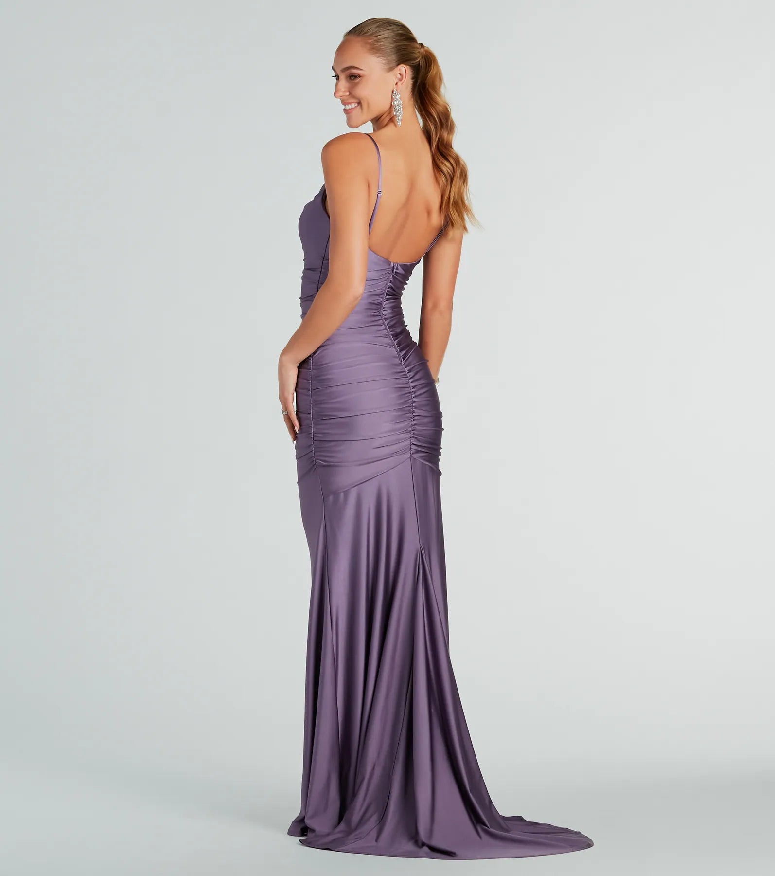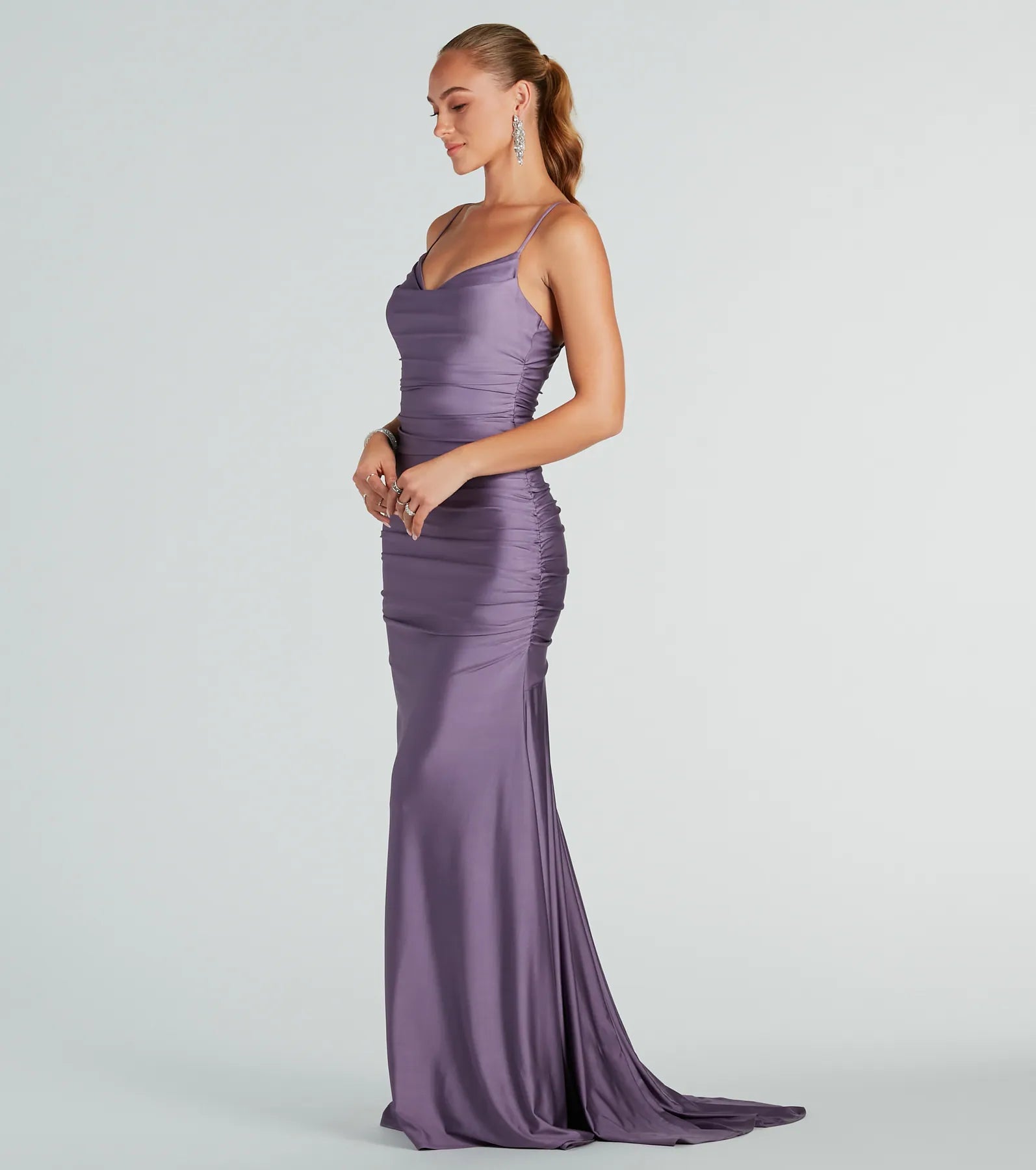 The Whitley formal ruched long mermaid dress will showcase your stunning silhouette at your next formal affair! Crafted from a stretchy smooth knit fabric. she features a sleeveless cowl neckline with a built-in padded bust so you don't have to worry about a bra. adjustable spaghetti straps for a customized fit. ruching down the back and side seams. a dramatic floor-sweeping hem with a cascading train. and an iconic mermaid silhouette to flaunt your curves. Style this formal long dress with rhinestone chandelier earrings.