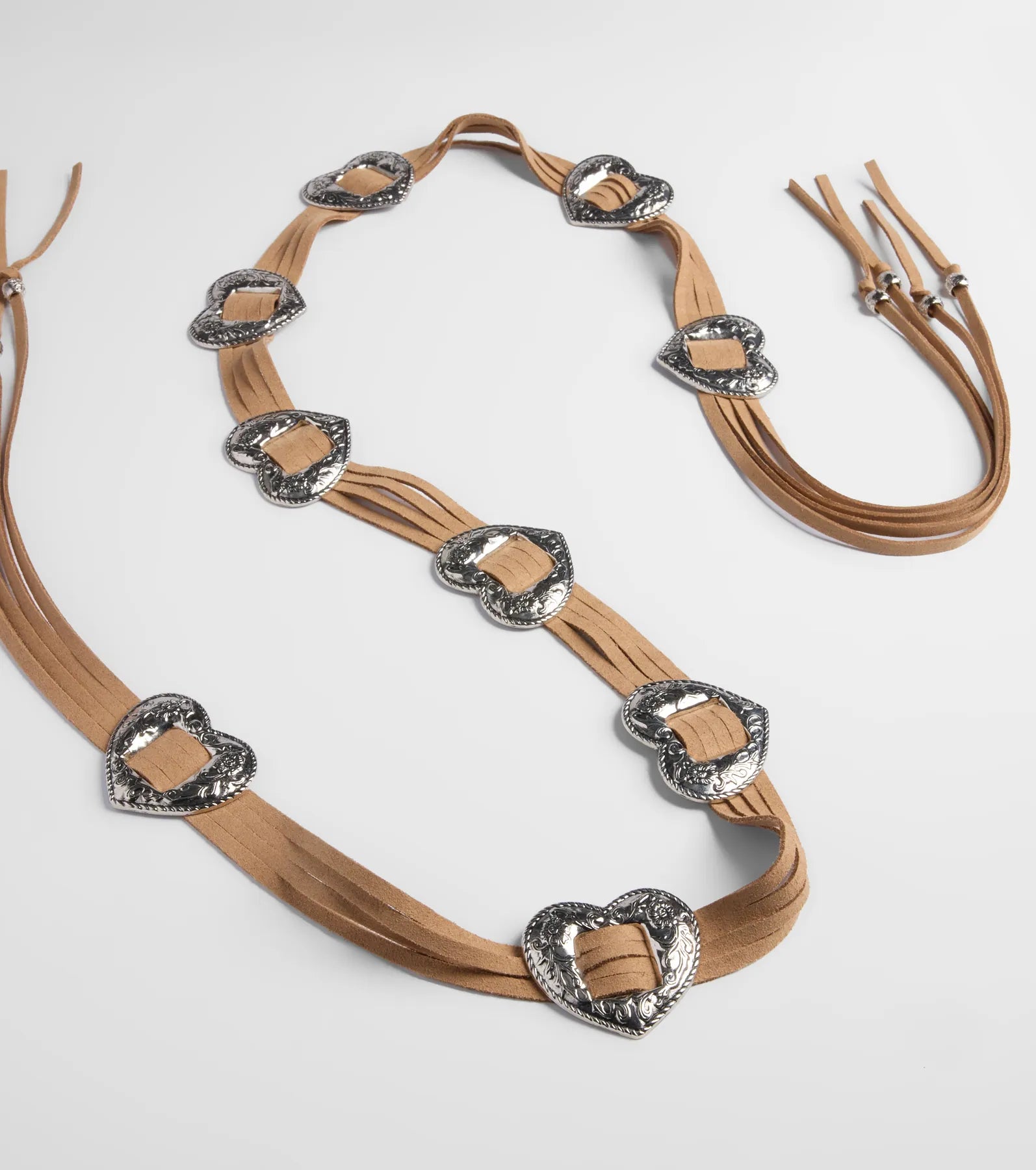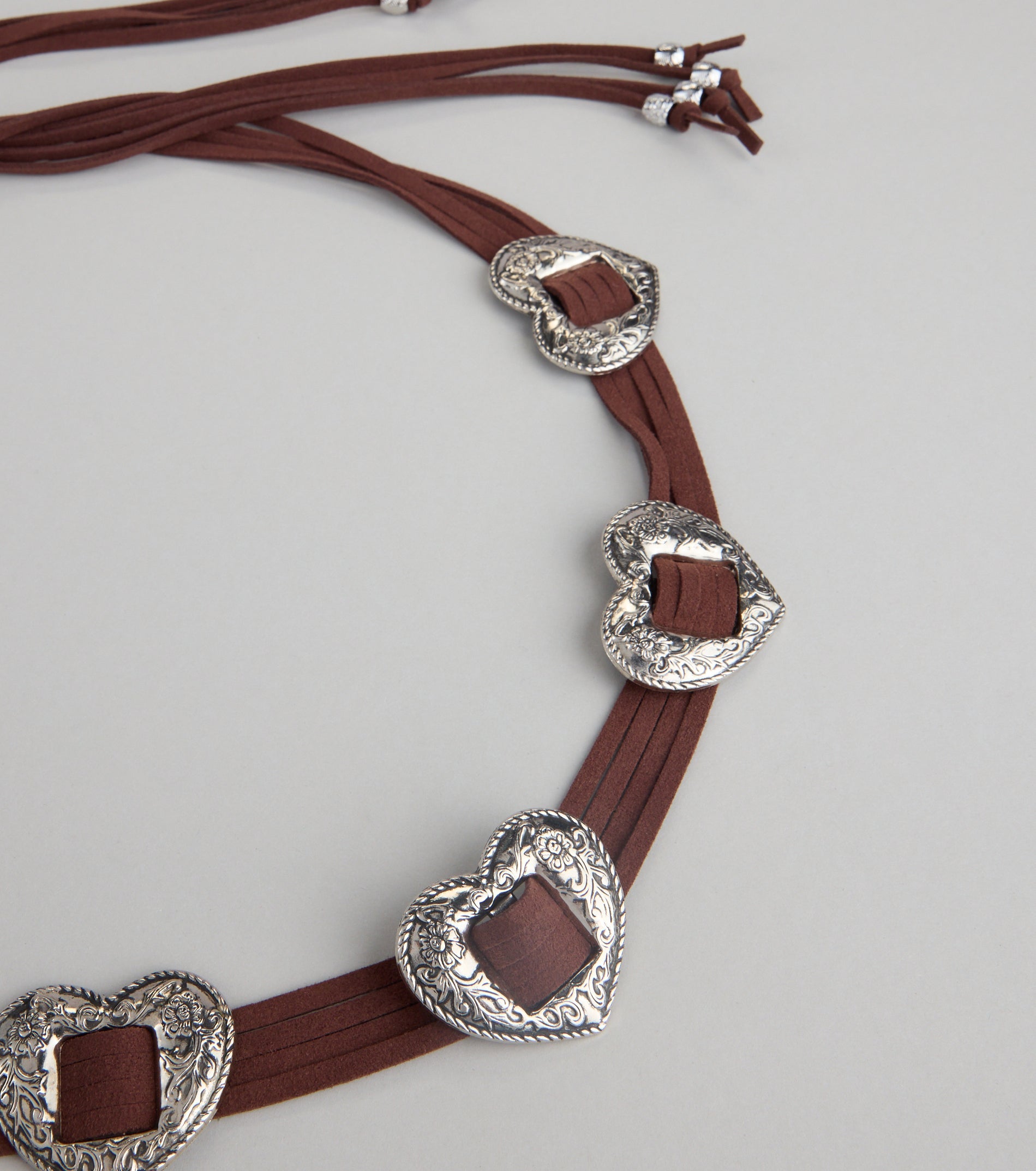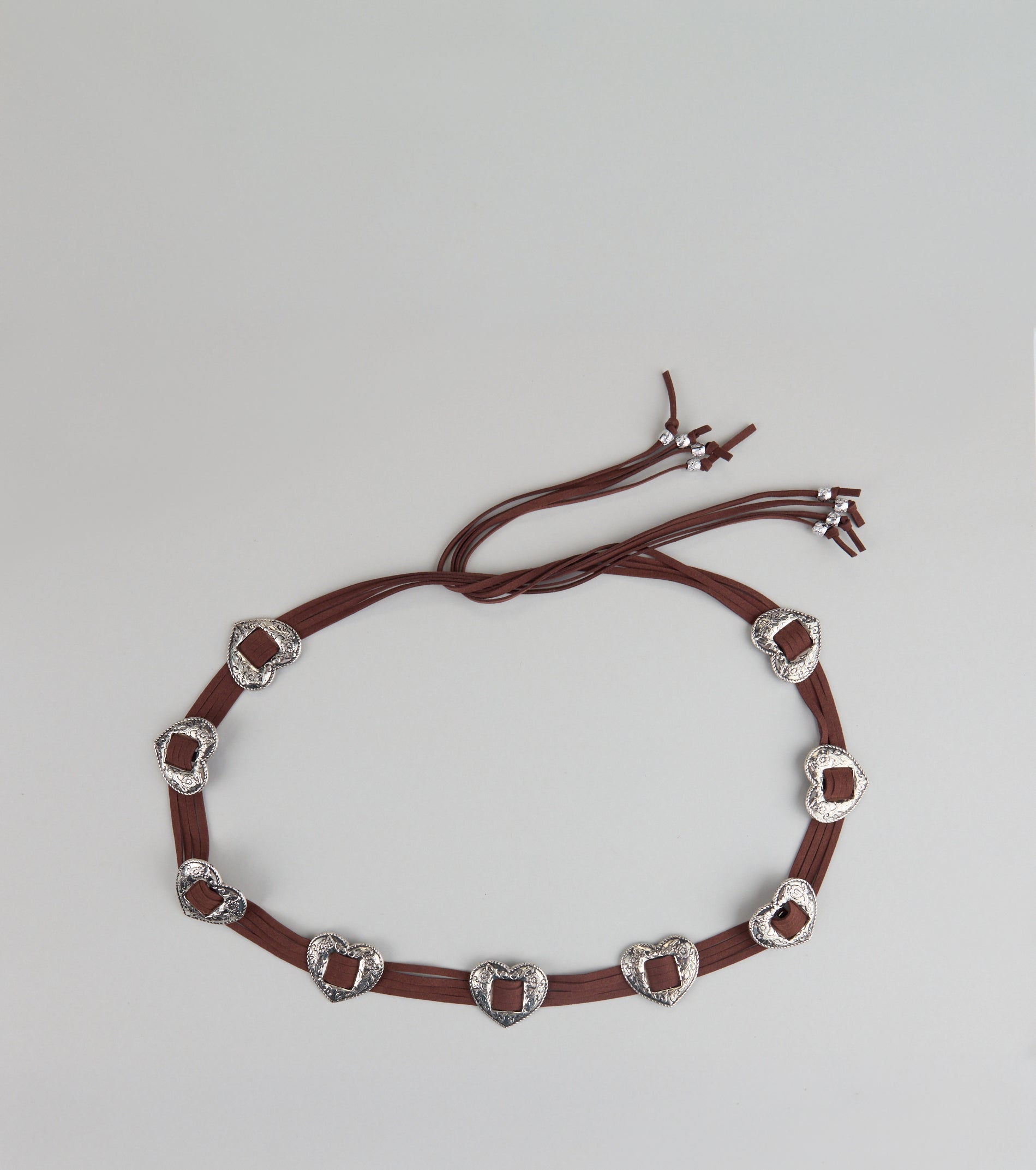 Tie your vibe together with this faux suede string belt with heart conchos. Pair with a western-inspired...